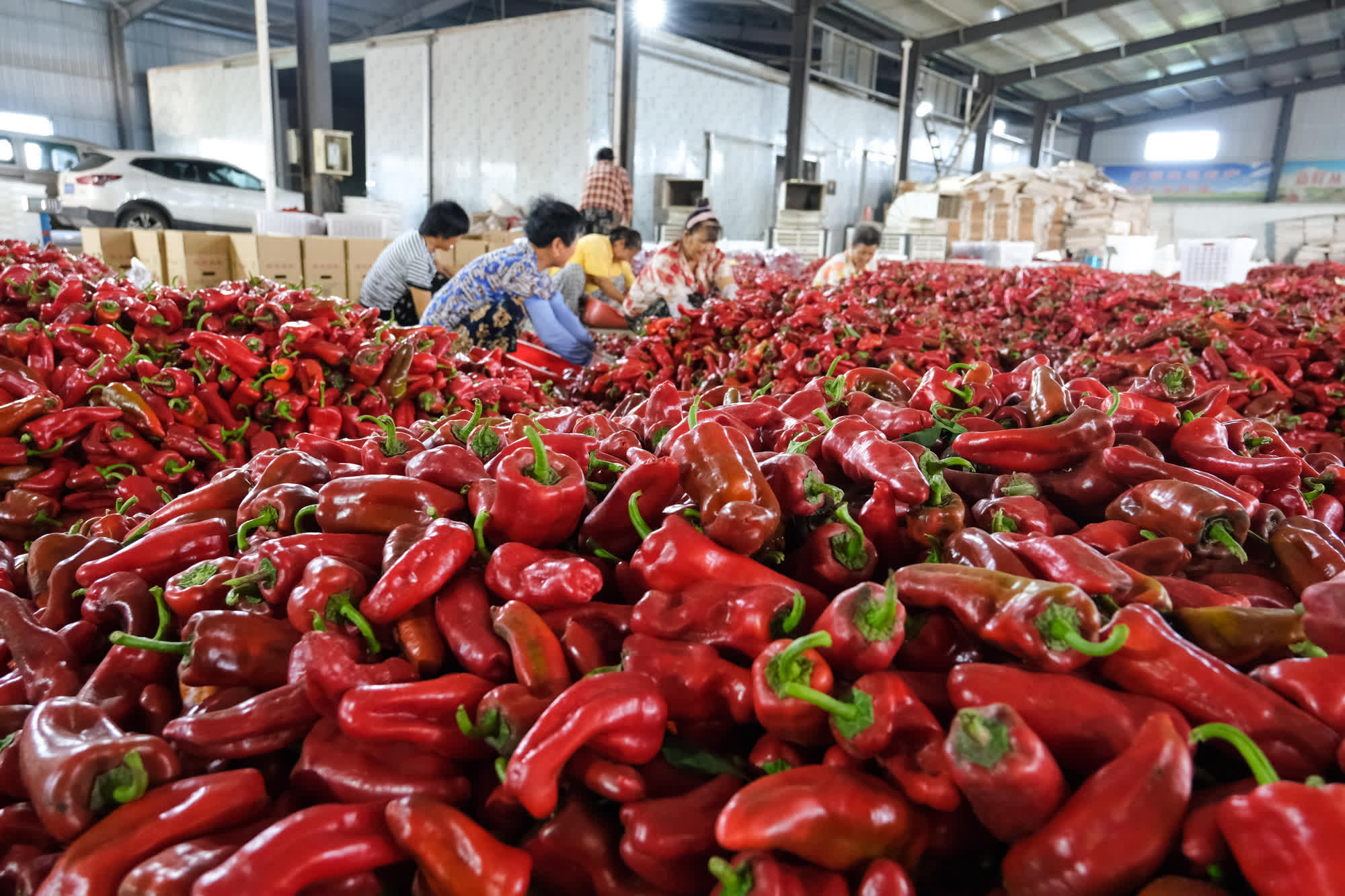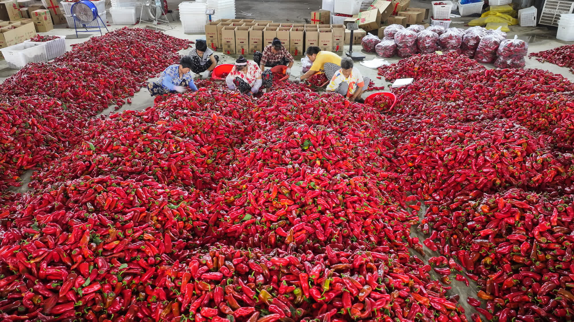 連日來,安徽省蚌埠市五河縣朱頂鎮陳台村2000多畝辣椒種植基地的有機泡椒進入成熟採摘期。一片片紅辣椒長勢喜人,椒枝上掛滿了紅彤彤的辣椒,村民們加緊採摘、分揀、裝運,供應北京、上海等長三角市場。