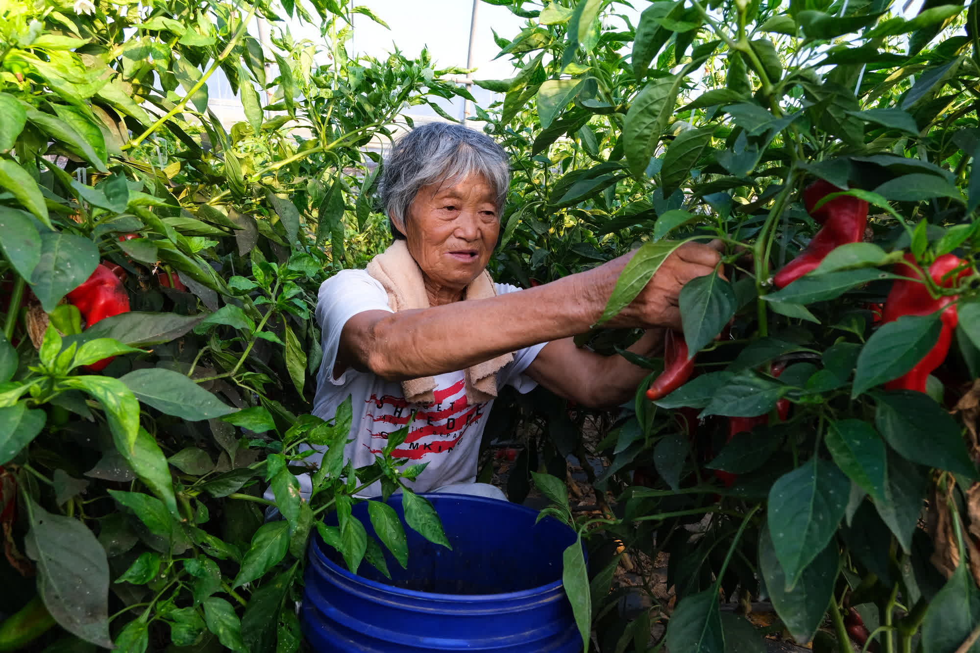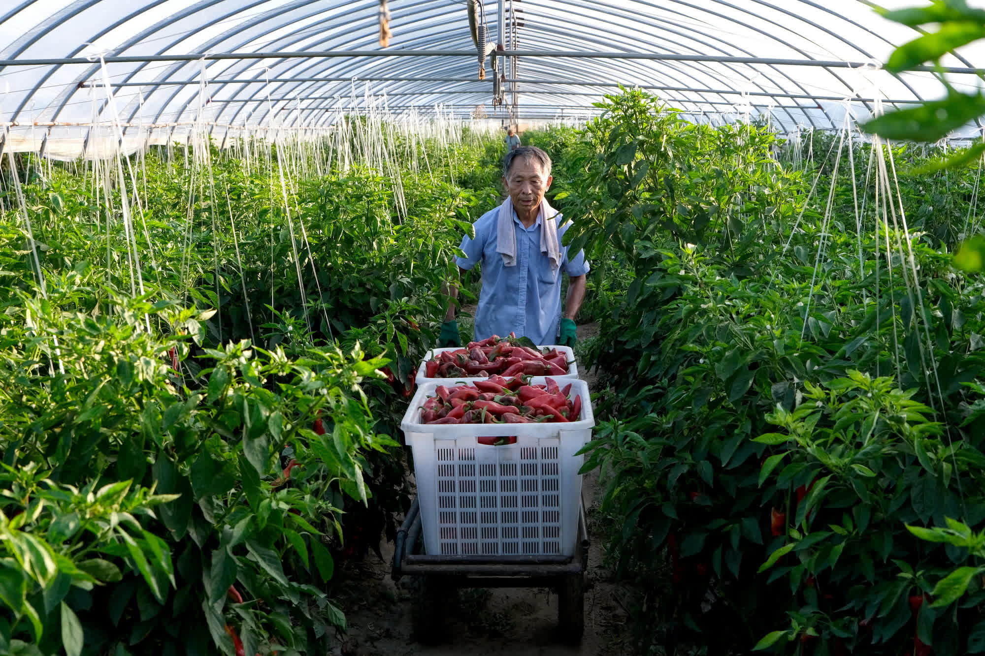 21日,在安徽省蚌埠市五河縣朱頂鎮陳台村的辣椒種植基地裏,工人們正忙着在大棚內採摘、分撿、打包辣椒,忙碌的場景構成了一幅美麗的豐收圖畫。
