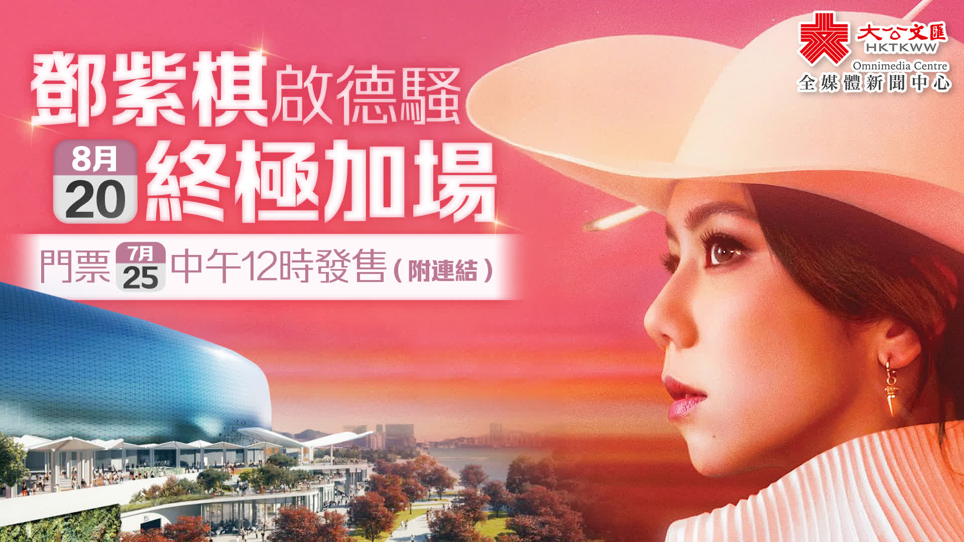 大公文匯全媒體報道,G.E.M.鄧紫棋早前官宣8月15日至17日啟德開騷,門票一經發售,迅速售罄。為了滿足更多歌迷的心願,繼8月19日加開一場後,今日(21日)鄧紫棋再次驚喜官宣,將在8月20日終極加開第5場。門票將於7月25日中午12時正式發售(點此購票)。值得留意的是,歌迷搶票前須預先登記成為快達票會員,過去曾註冊也須重新登記,並要通過手機號碼及電郵地址雙重驗證。(點此進入)