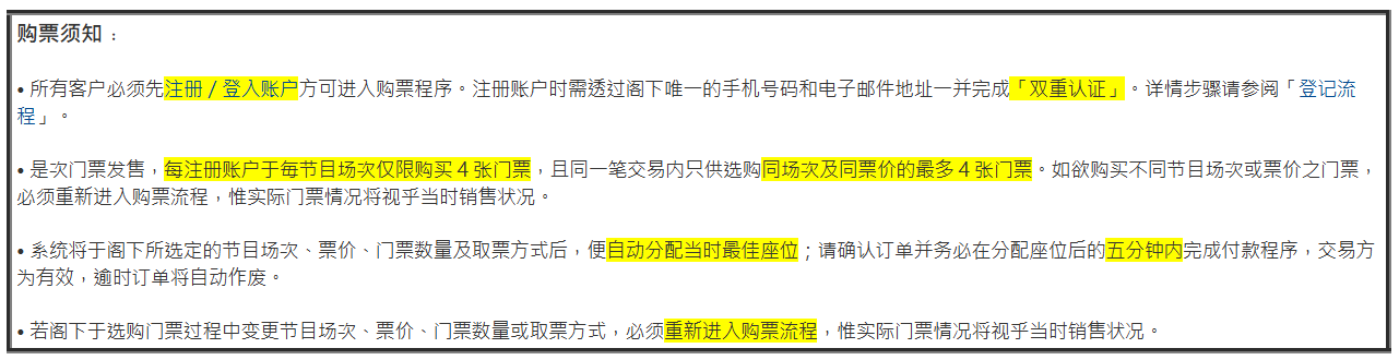 此外,購票須知列明每個賬戶最多搶4張門票,若更改選項須重新進入購票系統。另外系統自動分配座位後,5分鐘內須完成付款程序,否則逾時訂單將自動作廢。