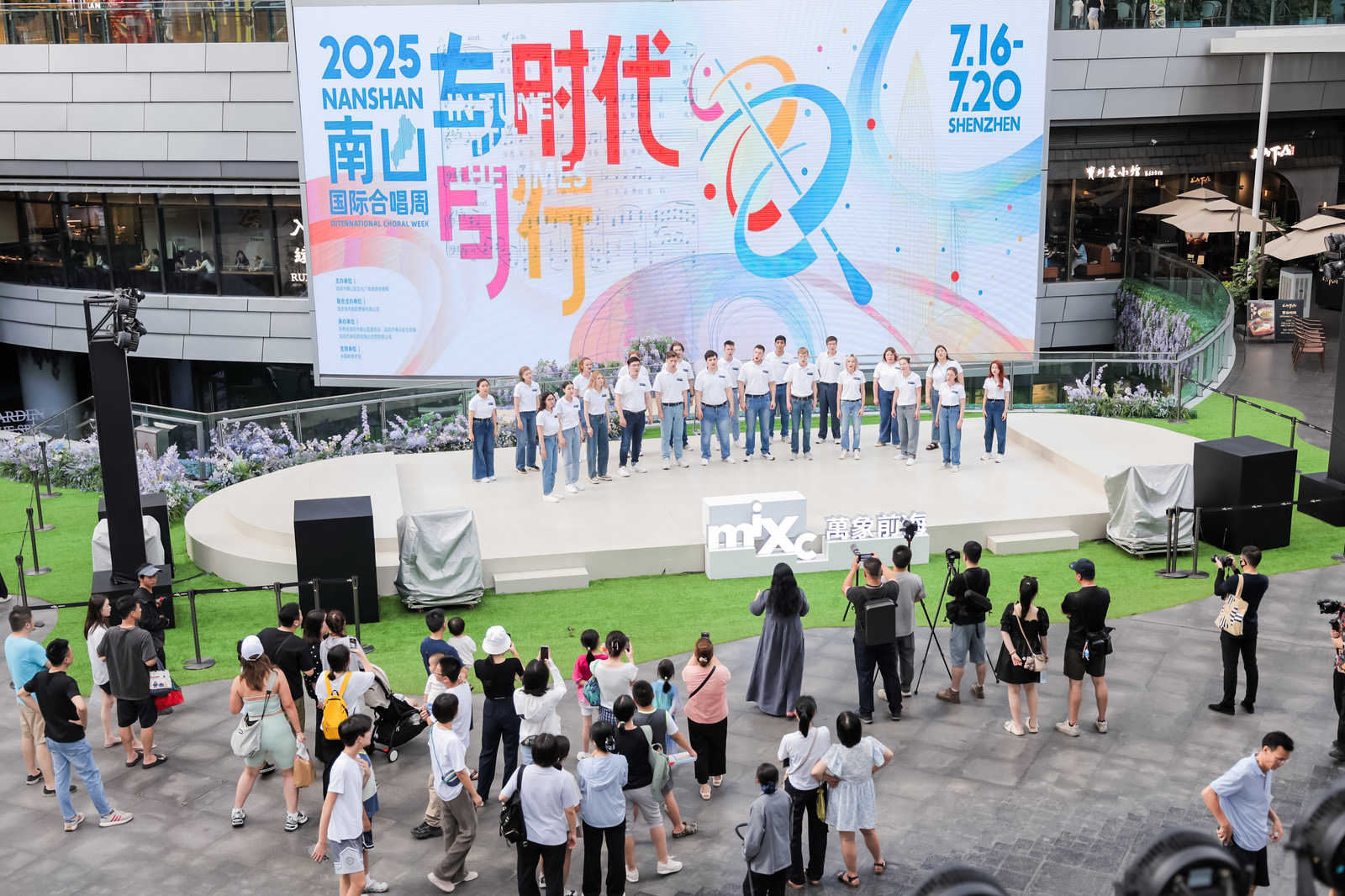 「伴夏快閃」在南頭古城、石洲中路、寫意三河、蛇口燈塔、萬象前海、海岸城等地標性景點開展。來自哈薩克斯坦、意大利、俄羅斯等5個國家的合唱團參與,其中,哈薩克斯坦Balatime青少年音樂工作室童聲合唱團帶來俄語版《月亮代表我的心》,熟悉旋律換獨特語言演繹,別具風情。合唱周期間同步開放的合唱生態市集與中國合唱教育及創作發展交流會,豐富了活動維度。南山合唱漫遊活動中,參演團隊遊覽城市地標,讓藝術交流延伸至城市肌理。來自多國的合唱團在City Walk中感受南山風貌,既以歌聲為城市注入藝術活力,也通過中外團員的互動傳播城市形象。
