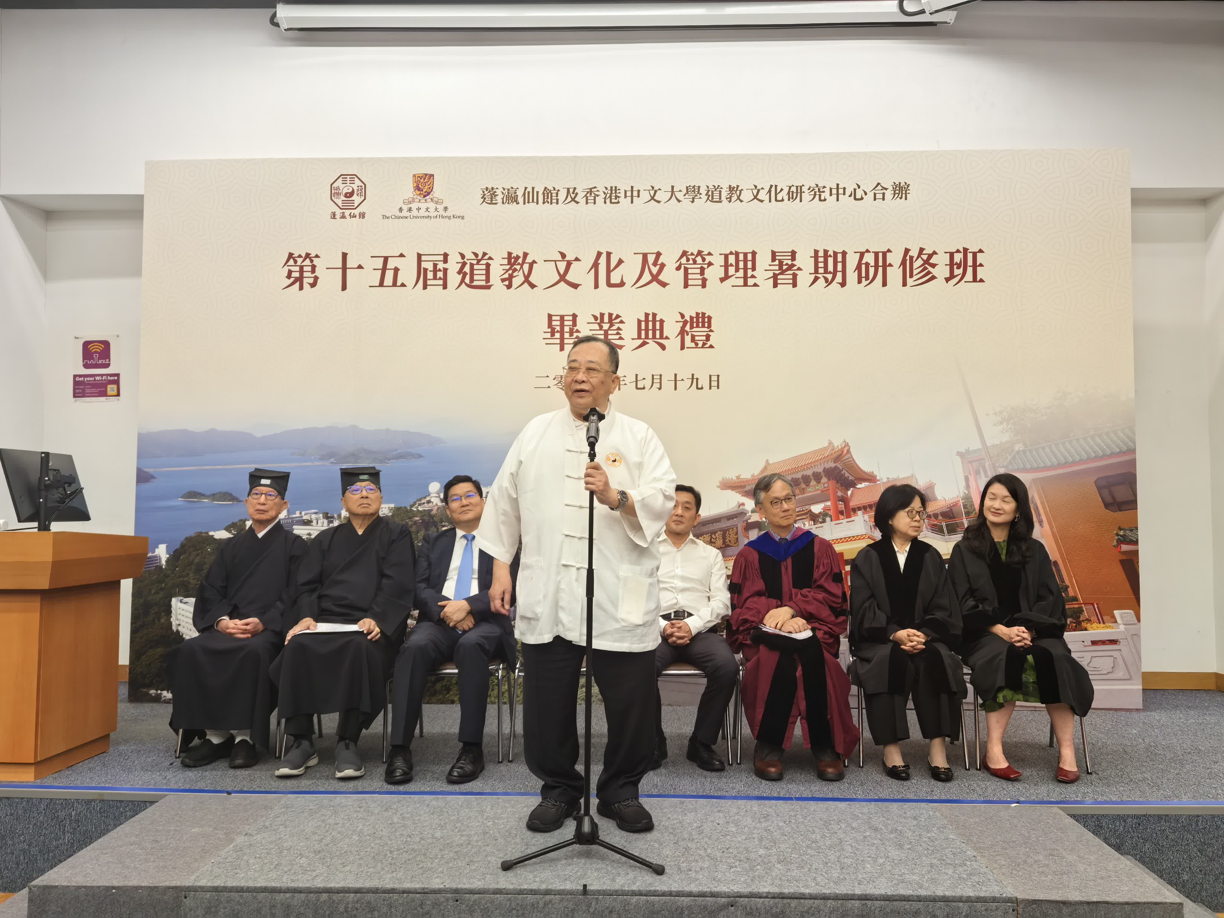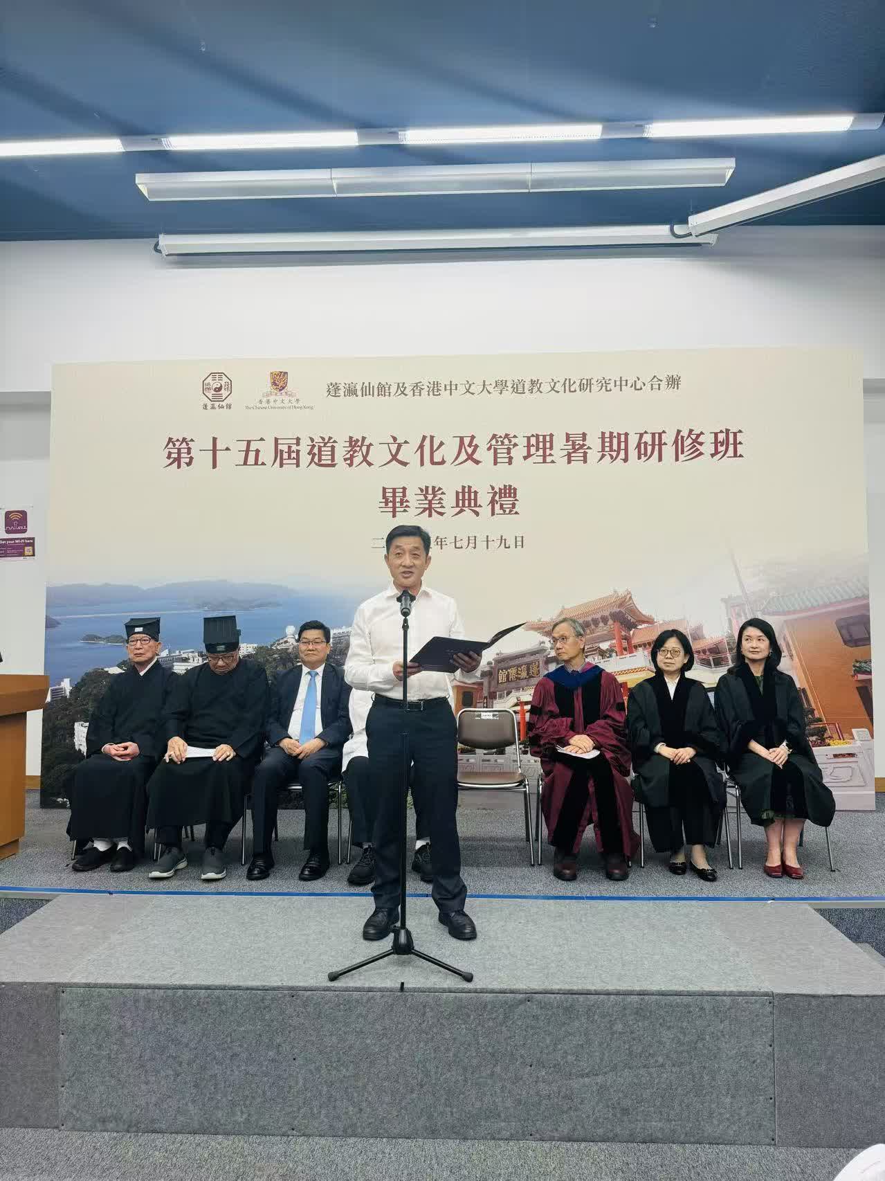盛夏香江,萬物並秀。7月19日下午,蓬瀛仙館與香港中文大學道教文化研究中心合辦的第十五屆道教文化及管理暑期研修班畢業典禮,在香港中文大學崇基學院利黃瑤璧樓2號演講廳舉行。中央駐港聯絡辦協調部副部長陳澤濤、中國道教協會秘書長匡盛、香港道教聯合會主席梁德華、香港中文大學道教文化研究中心主任黎志添教授、蓬瀛仙館副理事長林赤有道長、葉滿棠道長等各界嘉賓逾百人,見證了這一內地和香港道教合作交流的盛事。