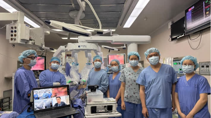 術前,手術團隊對患者肝臟儲備功能進行了全面而細緻的評估,科學合理地規劃手術切除範圍,並徵得患者知情同意施以遠程手術。術中,梁霄教授耐心細緻地完成一系列手術操作,包括分離腹腔粘連、病灶探查、游離及切除範圍規劃、術中止血、組織離斷及創面清理等。整場手術行雲流水,極為順利,僅用50分鐘便成功完成。手術期間,機器人運行穩定,圖像實時傳輸清晰,語音交互流暢,法國浙江兩地輔助專家以精湛的技術和默契的配合,完成了所有預定手術目標。