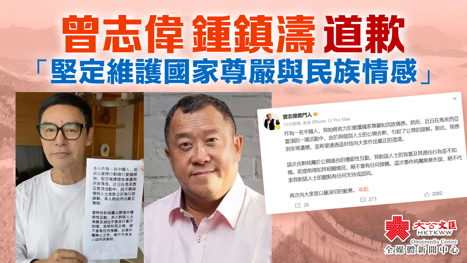 大公文匯全媒體報道,7月20日,曾志偉、鍾鎮濤在馬來西亞雲頂的公開活動中,與馬來西亞極端反華歌手黃某志合影。黃某志長期發表反華言論,受境外反華勢力資助。黃某志將合影發布於社交媒體炫耀,引發公眾對曾志偉、鍾鎮濤立場的質疑。而後曾志偉、鍾鎮濤與某反華歌手黃某志合影后雙雙發文道歉表示「堅定維護國家尊嚴與民族情感」。