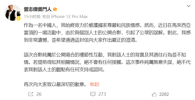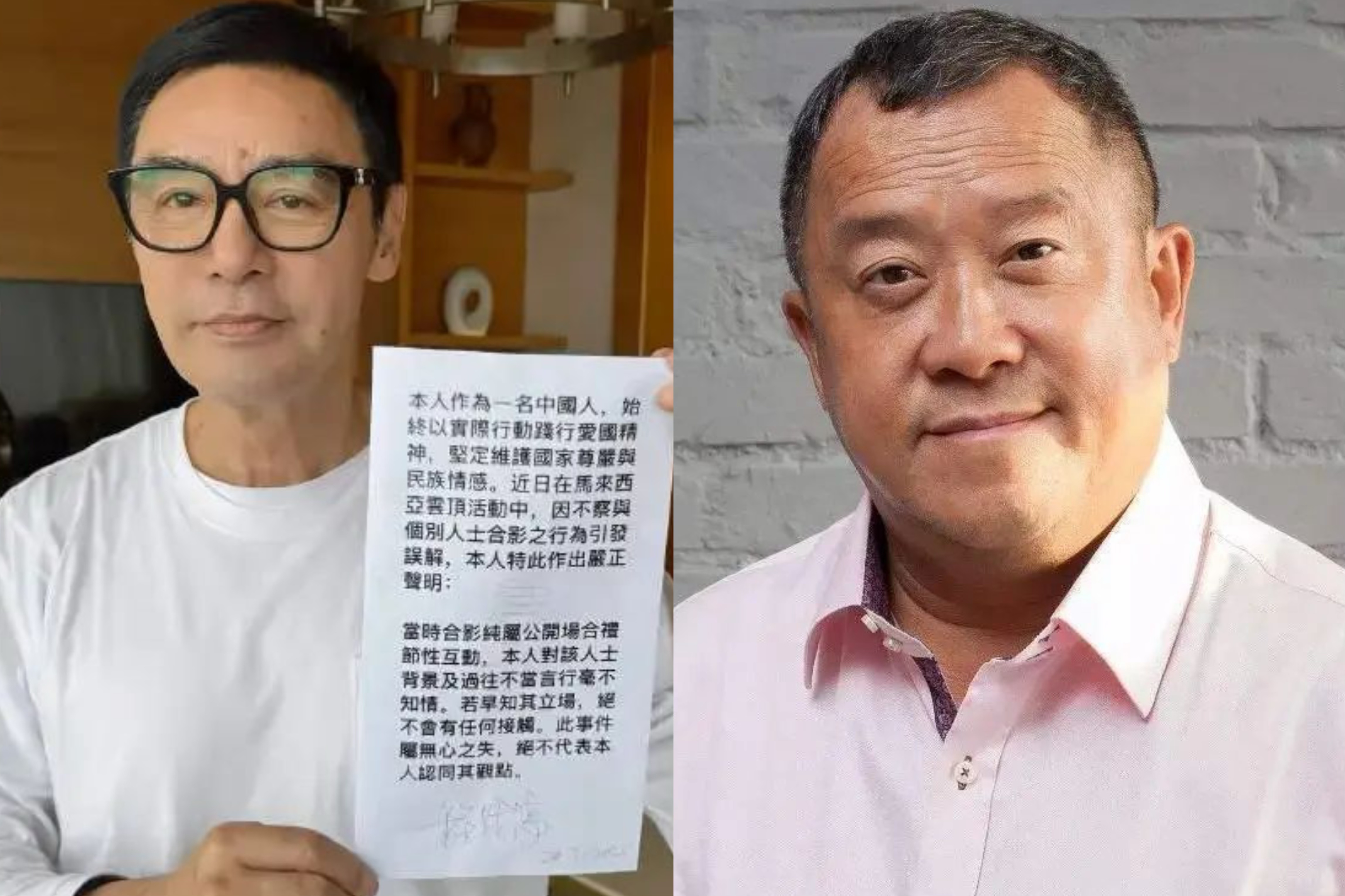 「作為一名中國人,我始終致力於維護國家尊嚴和民族情感。然而,近日在馬來西亞雲頂的一場活動中,由於與個別人士的公開合影,引起了公眾的誤解。對此,我感到非常遺憾,並希望通過這封信向大家作出嚴正的澄清。」