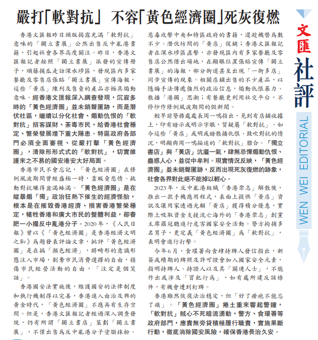 香港文匯報昨日頭版揭露充滿「軟對抗」意味的「獨立書展」公然出售反中亂港書籍,引起社會各界高度關注。昨日,香港文匯報記者按照「獨立書展」派發的宣傳冊子,順藤摸瓜走訪深水埗區,發現區內多家餐廳及零售店張貼「獨立書展」宣傳海報,這些「黃店」陳列及售賣的產品亦極具煽動意味。經香港文匯報深入調查發現,沉寂多時的「黃色經濟圈」並未銷聲匿跡,而是潛伏社區,繼續以分化社會、煽動仇恨的「軟對抗」招客謀財、荼毒市民,給香港社會穩定、繁榮發展埋下重大隱患。特區政府各部門必須全面審視、從嚴打擊「黃色經濟圈」,清除形形式式的「軟對抗」,切實維護來之不易的國安港安大好局面。