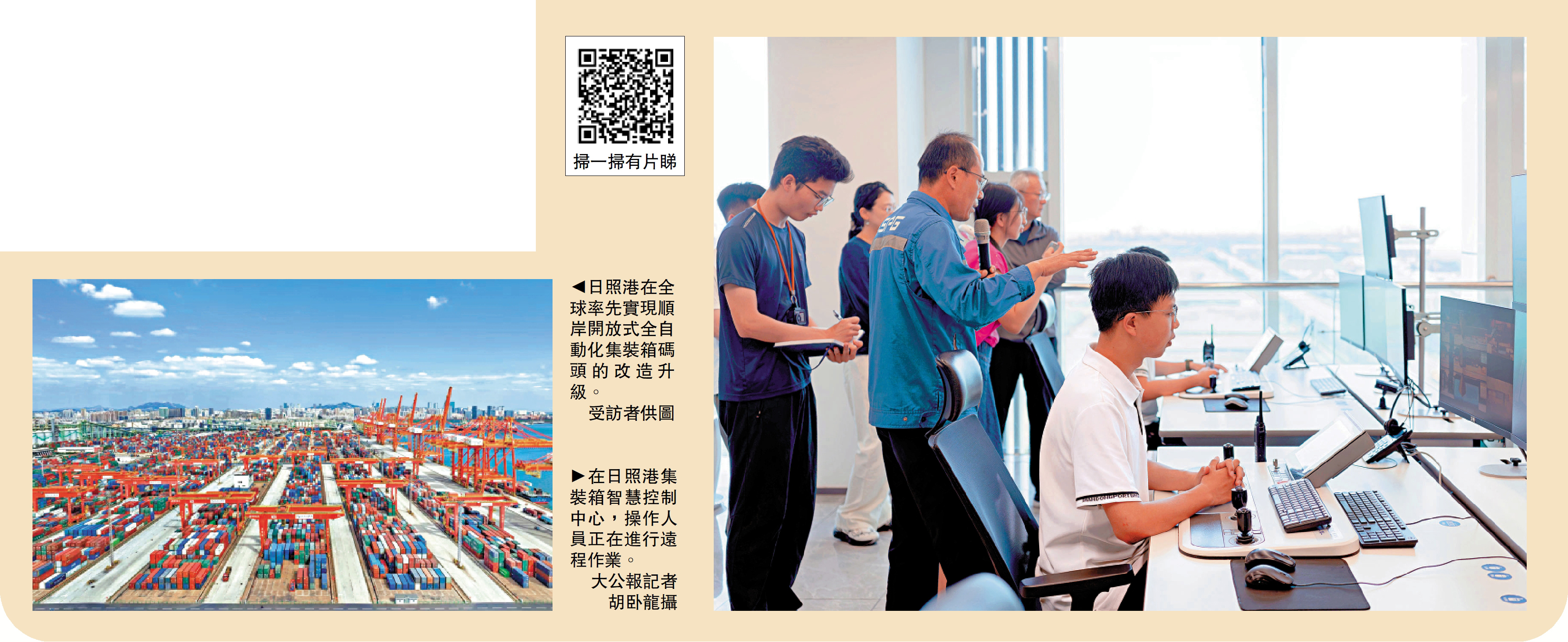 (大公報 實習記者 黃逸飛 日照報道)7月14日,「2025范長江行動香港傳媒學子山東行」學子們來到山東港口日照港石臼港區。這裏是全球最年輕的5億噸級港口,平均每5秒鐘就有一個集裝箱起落,年貨物吞吐量位居世界第七。這個由「因煤而生」的傳統碼頭升級而來的自動港口,借助北斗、5G、數字孿生、DeepSeek等新興技術,正在全球化的浪潮中,展現出更加強大的活力。