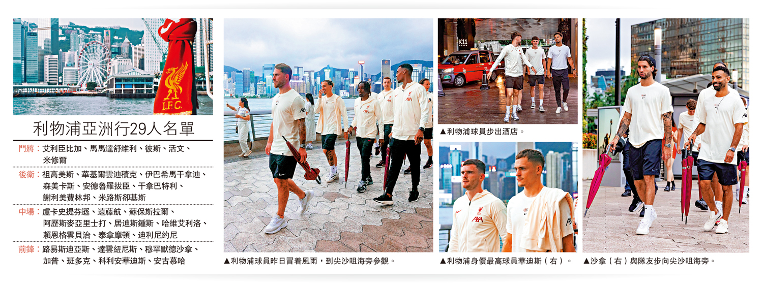 利物浦在熱身賽大勝史篤城後,公布訪港的29人名單,可說是精銳盡出,盛傳離隊的路易斯迪亞斯、伊巴希馬干拿迪及哈維艾利洛都在名單之中,亞洲行隨時是他們的告別之旅;至於離隊機會更高的意大利球星費達歷高基艾沙則未有入選名單,即代表無緣訪港。