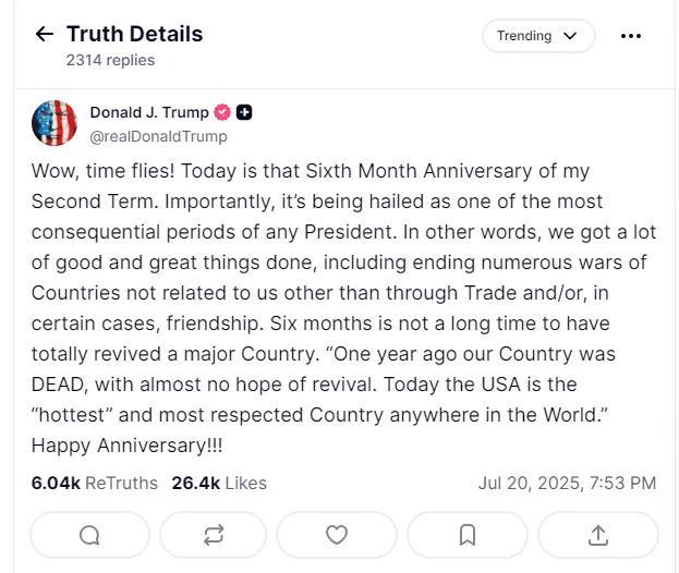 「哇,時間飛逝!今天是我第二個任期的半周年紀念日。」特朗普寫道,「重要的是,這段時間被認為是歷任總統任期內最具影響力的時期之一。換句話說,我們做了很多好事和大事,結束了多場與我們無關的國家的戰爭……」