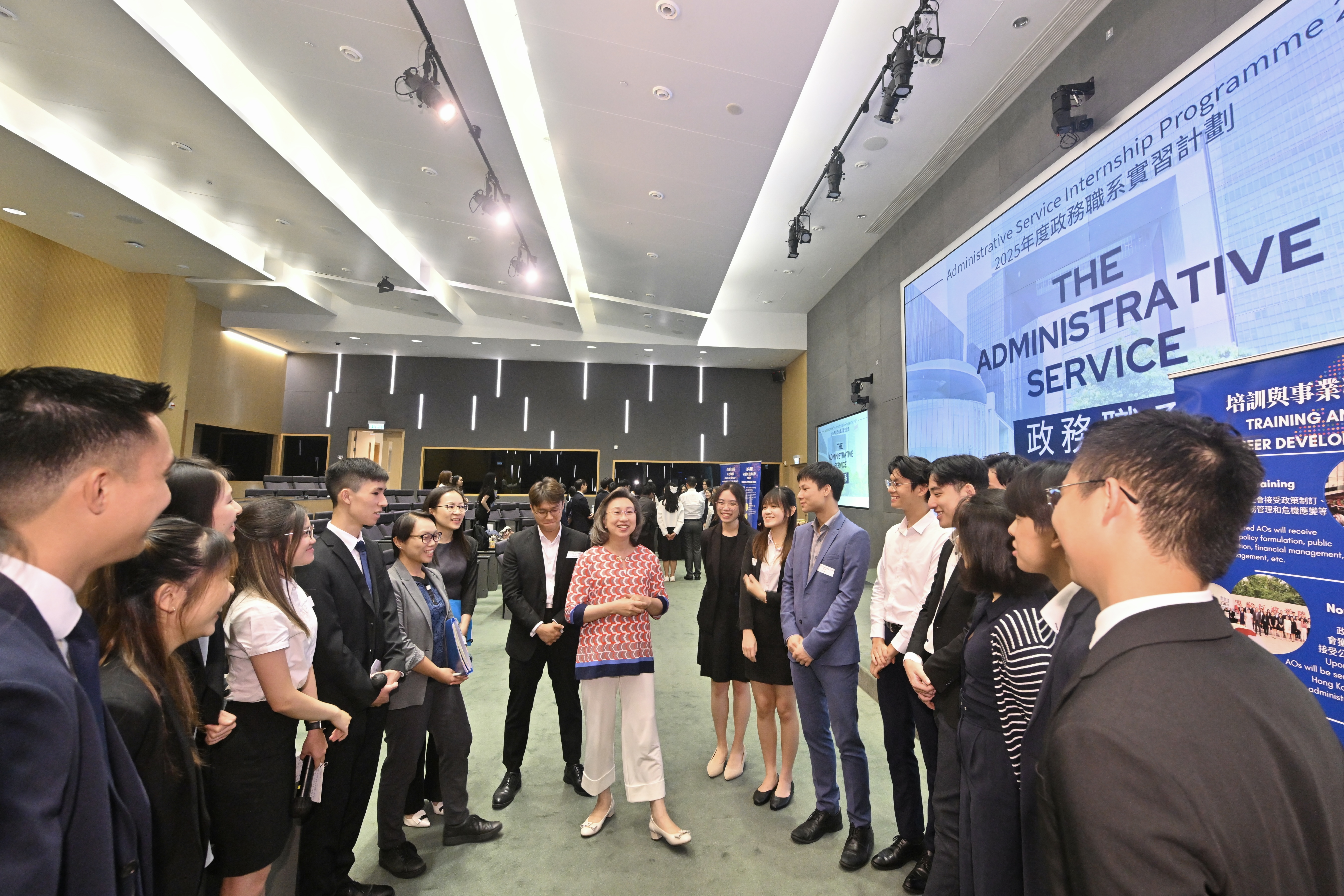 她說:「我知道今輪實習計劃接獲的報名人數創新高,吸引了本地、內地以至海外超過300名大專生報名申請。從大家的分享中,我感受到大家對公共服務的熱誠。我希望藉此呼籲有志服務社會、敢於承擔的年輕人積極考慮加入公務員行列。」