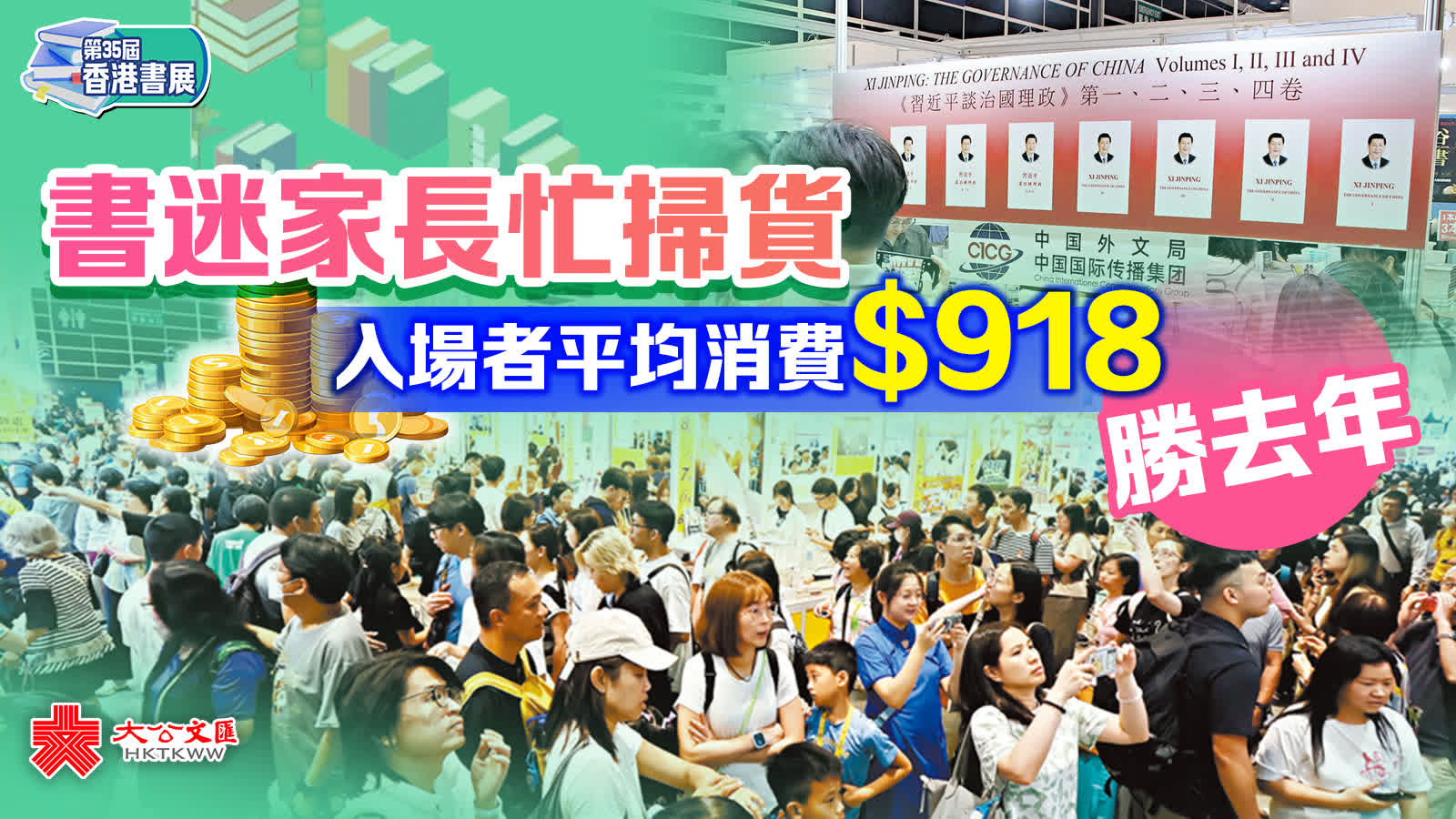(香港文匯報 記者 張弦)於灣仔會展中心舉行的第三十五屆香港書展,聯同第八屆運動消閒博覽及第五屆零食世界昨日圓滿閉幕。雖在颱風「韋帕」吹襲下,周日被迫休市,但三項展覽於6天展期仍合共吸引89萬人次入場,調查指入場人士於書展內平均消費918元,較去年微升,丁財兩旺收官。不少書迷、家長等昨日帶同手拖車或行李箱到書展作最後衝刺,冀搶購筍貨,參展商亦趁最後一日推出多種優惠吸引更多顧客,例如50元任選4本食譜、財經或兒童書等特價書,引起不少書迷聚集挑選。有參展商表示,今年正值抗戰勝利80周年,相關書籍備受追捧,又指即使因颱風而停業一天,人流及銷情均勝於去年,估計銷售額增長近10%。
