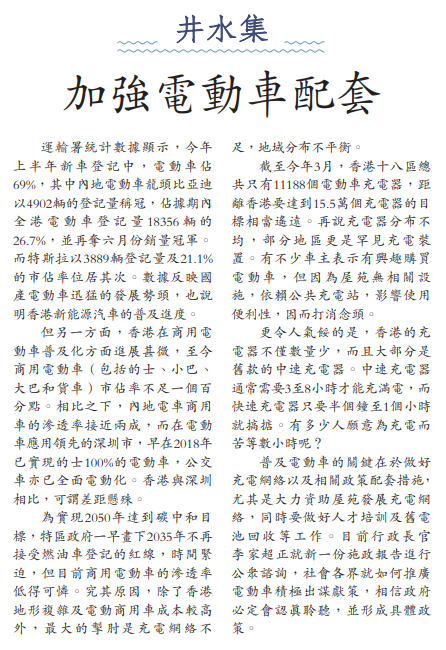 普及電動車的關鍵在於做好充電網絡以及相關政策配套措施,尤其是大力資助屋苑發展充電網絡,同時要做好人才培訓及舊電池回收等工作。目前行政長官李家超正就新一份施政報告進行公眾諮詢,社會各界就如何推廣電動車積極出謀獻策,相信政府必定會認真聆聽,並形成具體政策。