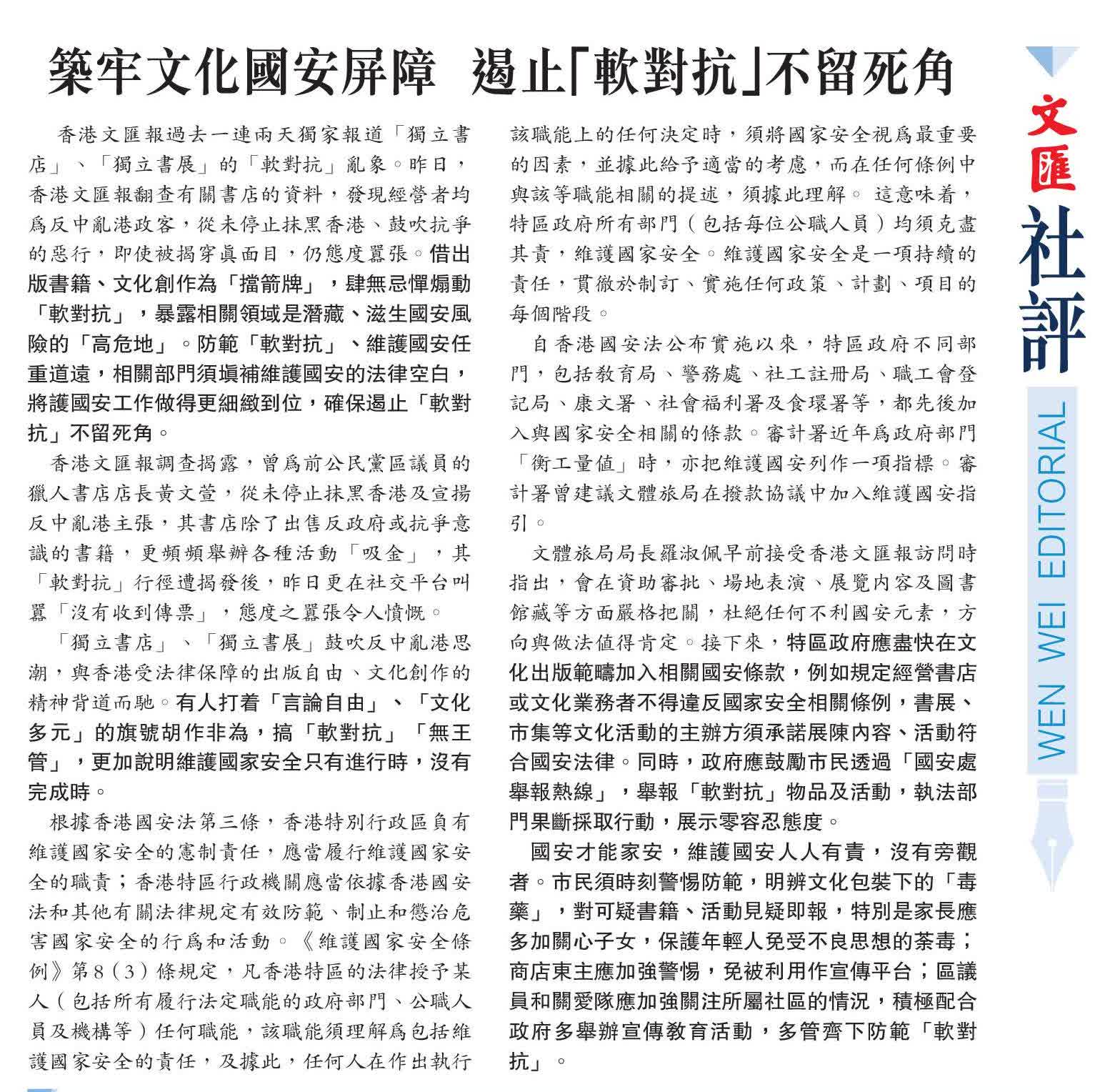 文體旅局局長羅淑佩早前接受香港文匯報訪問時指出,會在資助審批、場地表演、展覽內容及圖書館藏等方面嚴格把關,杜絕任何不利國安元素,方向與做法值得肯定。接下來,特區政府應盡快在文化出版範疇加入相關國安條款,例如規定經營書店或文化業務者不得違反國家安全相關條例,書展、市集等文化活動的主辦方須承諾展陳內容、活動符合國安法律。同時,政府應鼓勵市民透過「國安處舉報熱線」,舉報「軟對抗」物品及活動,執法部門果斷採取行動,展示零容忍態度。