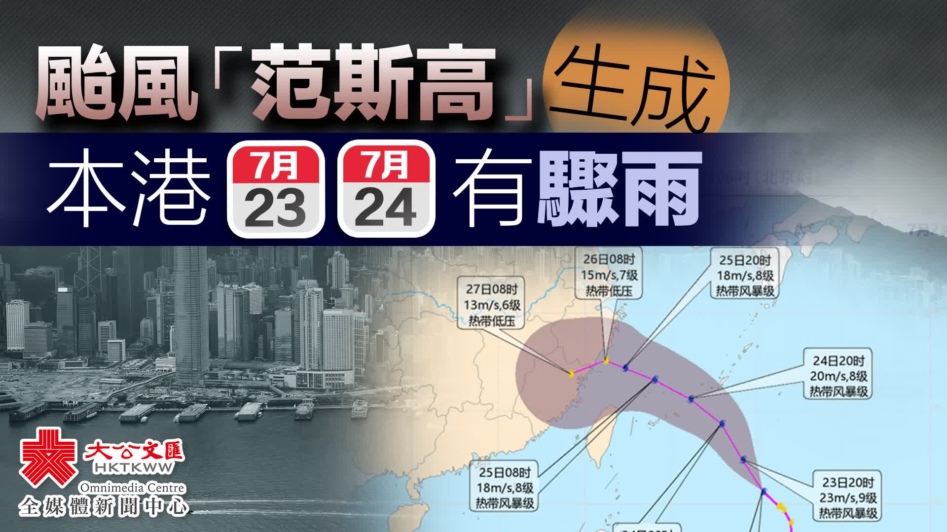 香港天文台今早表示,位於呂宋海峽以東的熱帶低氣壓已增強為熱帶風暴,並命名為「范斯高」。在上午10時,范斯高集結在沖繩島之東南偏南約670公里,預料向西北移動,時速約22公里,大致移向琉球群島一帶。