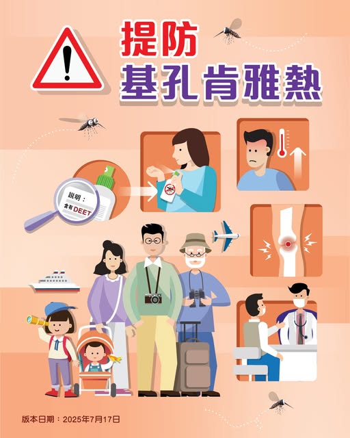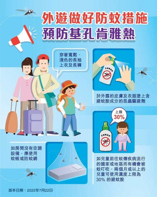 此外,目前沒有預防基孔肯雅熱的疫苗在本港獲註冊。預防基孔肯雅熱的最佳方法是避免被蚊子叮咬,以及防止蚊子繁殖。