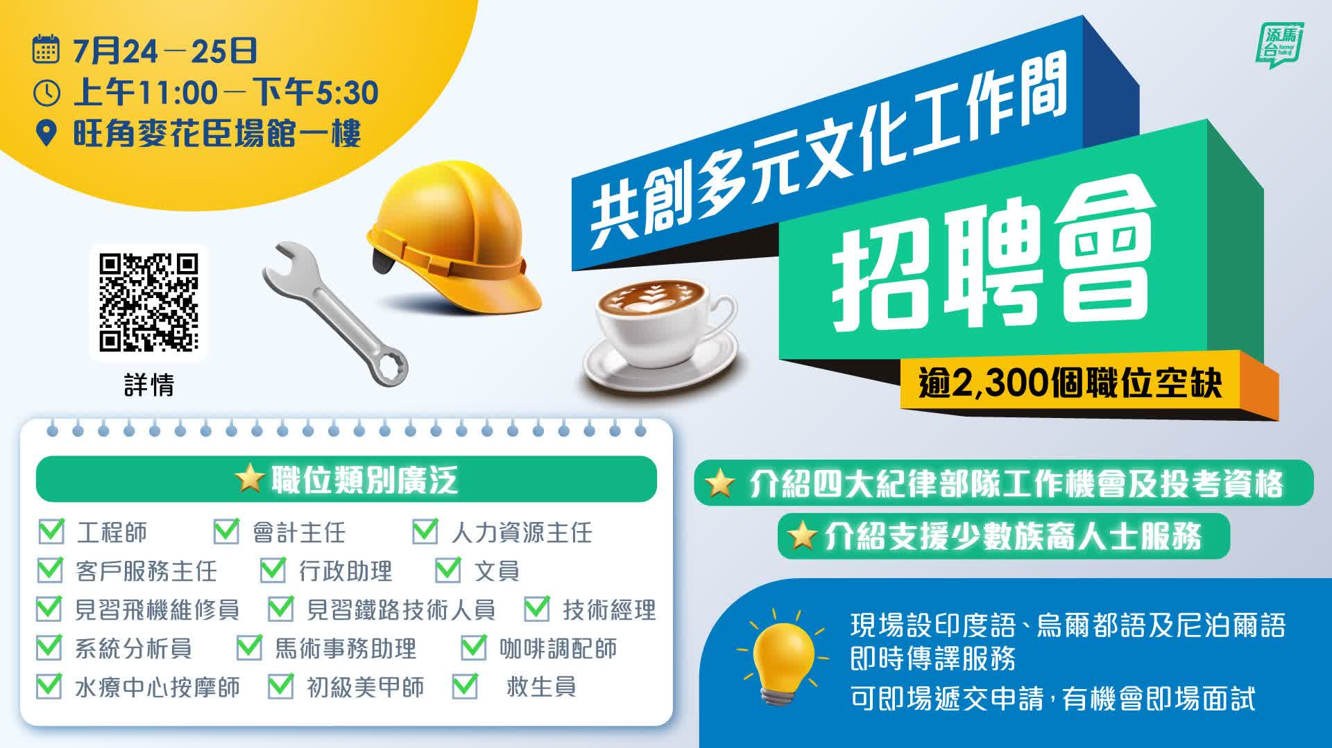 共創多元文化工作間招聘會將於星期四及五(7月24日及25日)在旺角麥花臣場館舉行。約50間機構合共提供超過2,300個職位空缺,類別相當廣泛。現場並設有印度語、烏爾都語及尼泊爾語即時傳譯服務。歡迎少數族裔及所有求職人士參加,費用全免。看圖了解更多。
