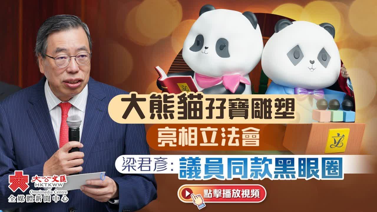 兩隻熊貓坐在立法會大樓上,「家姐」手持議事規則,「細佬」則在咪兜接受傳媒訪問。梁君彥亦感謝中旅集團贈送獨一無二、人見人愛、別具立法會特色的大熊貓雕塑。
