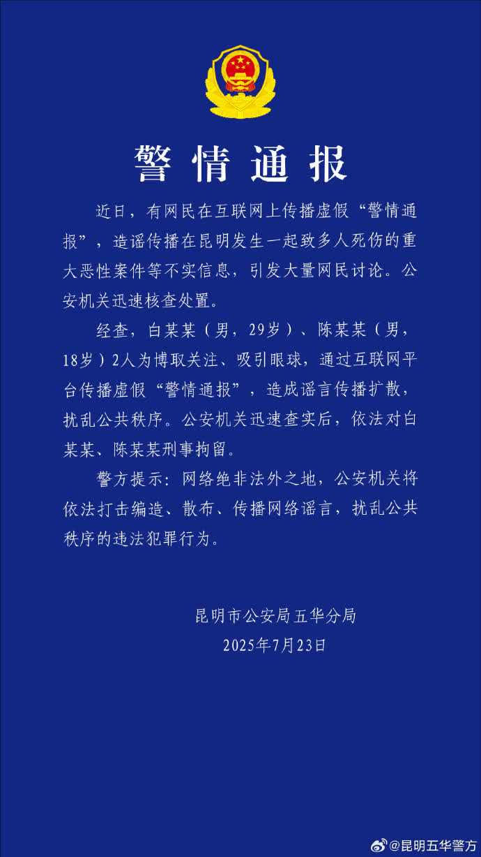 大公文匯全媒體報道,7月23日中午,昆明市公安局五華分局發布警情通報: