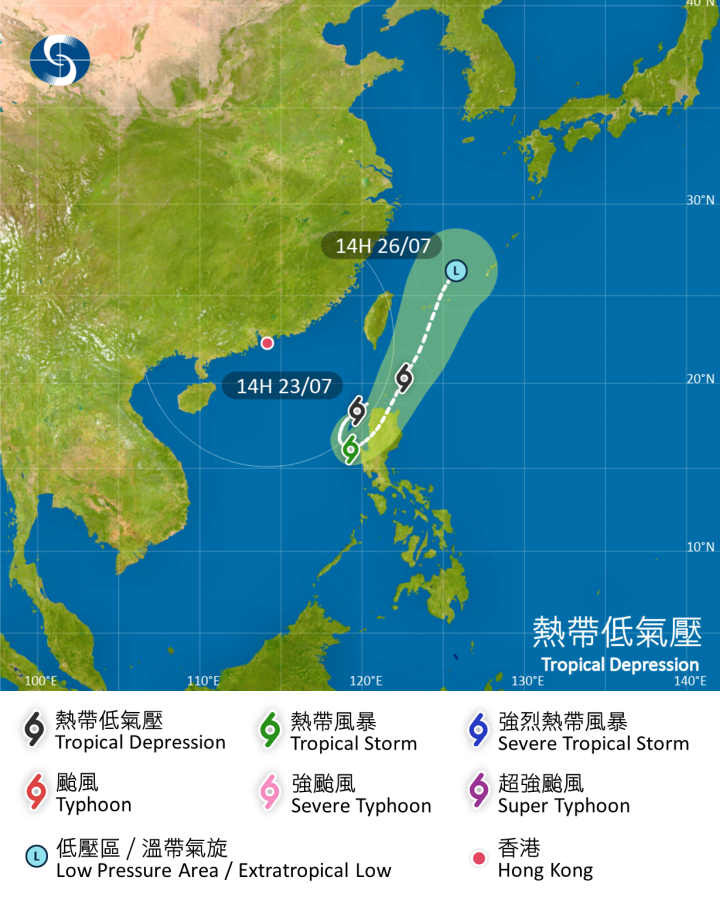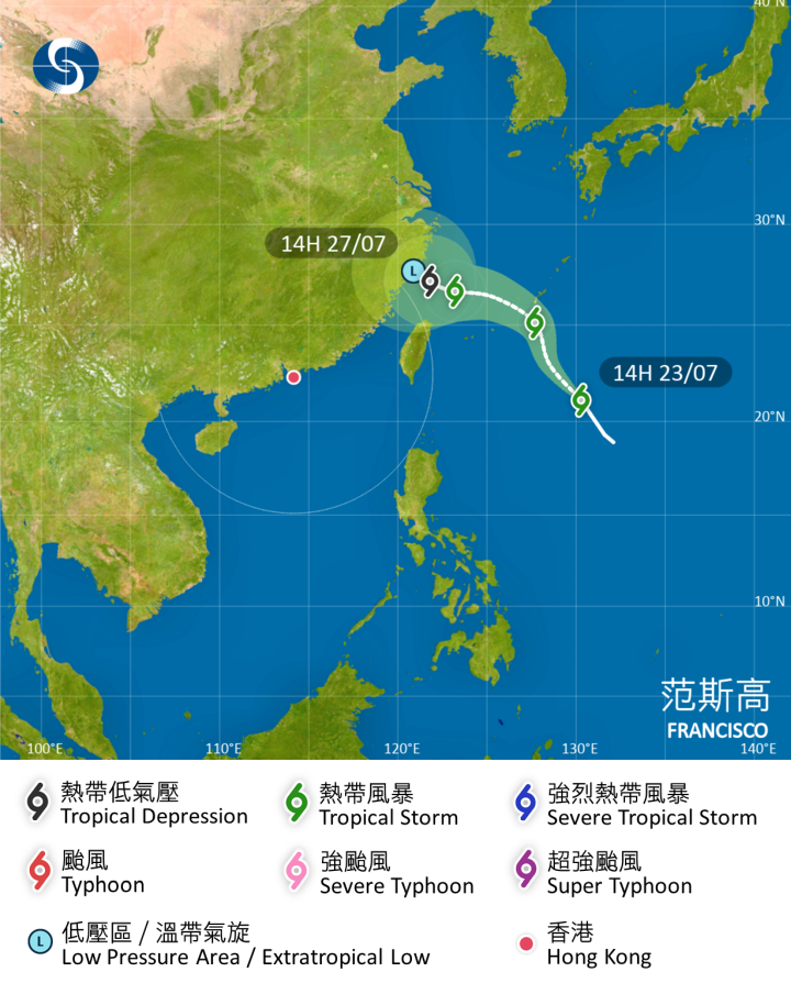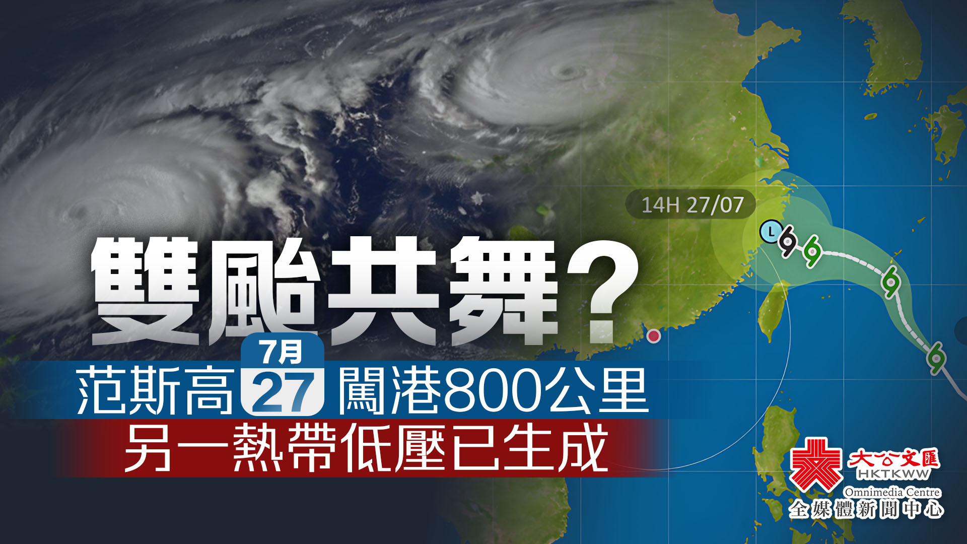 另外,目前位於呂宋海峽以東的熱帶風暴「范斯高」,將在未來一兩日橫過琉球群島一帶海域,隨後移向中國東南沿岸。根據預測路徑,范斯高未來一兩日會維持熱帶風暴級別,到周日(7月27日)移至台灣東北面後,將貼近香港800公里範圍界線。