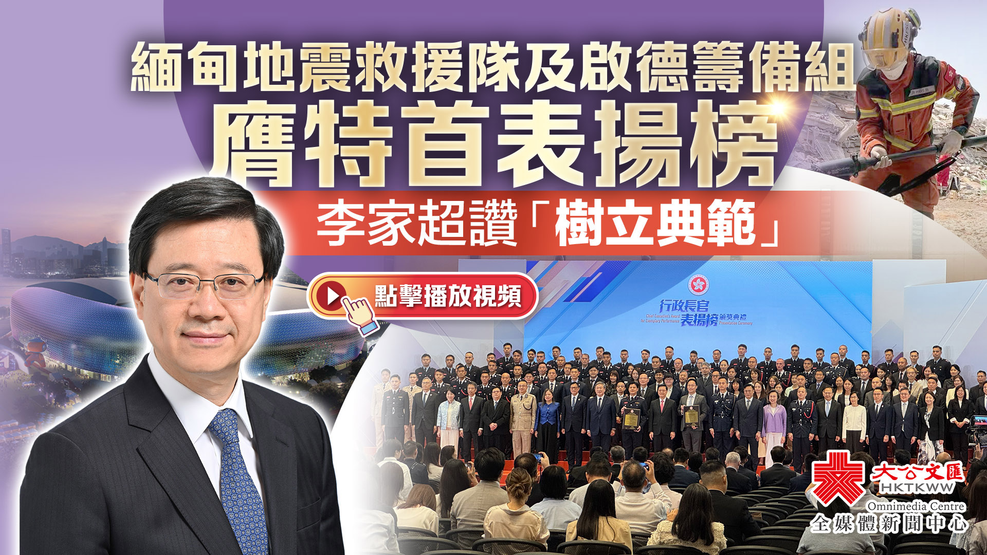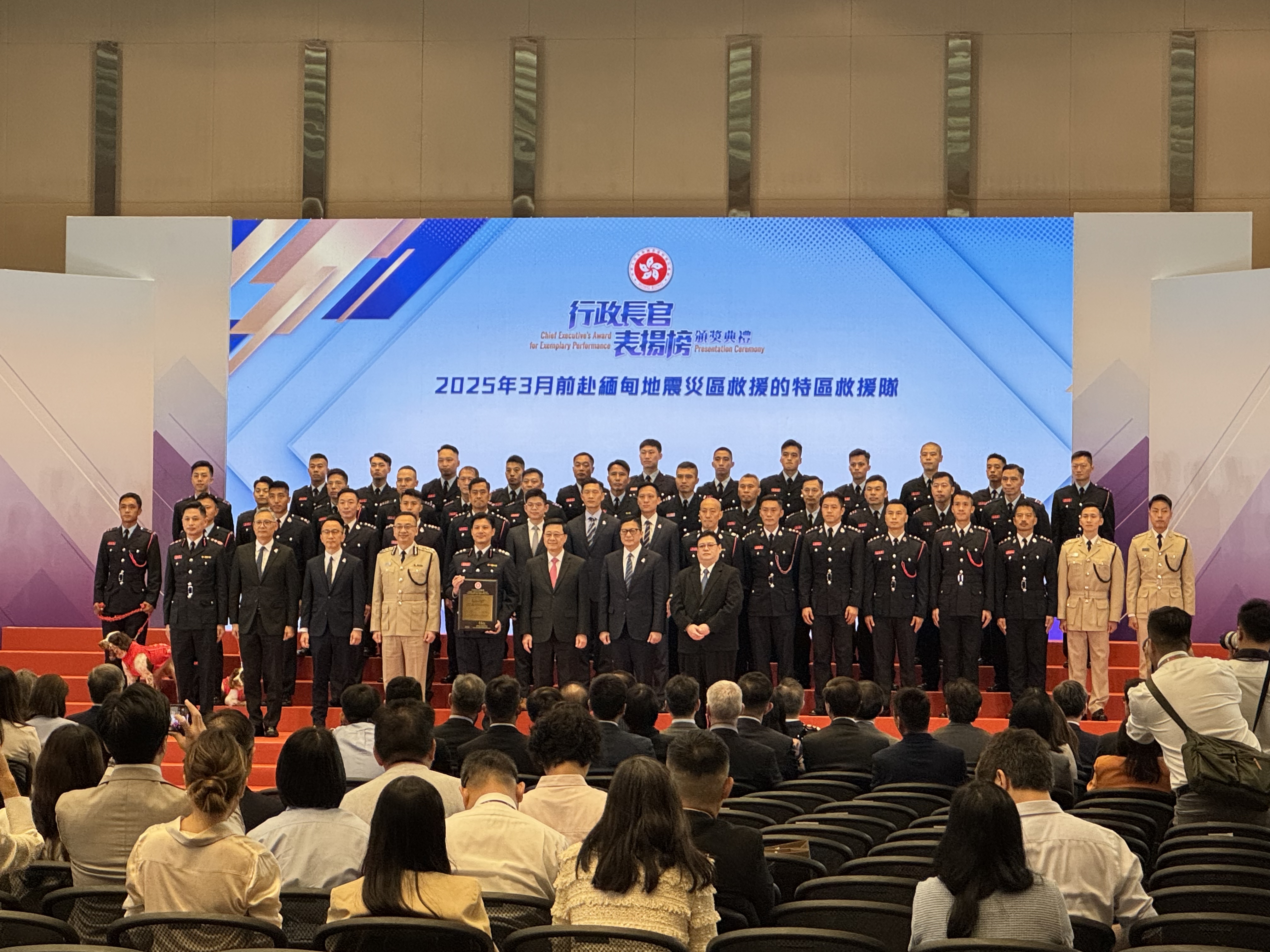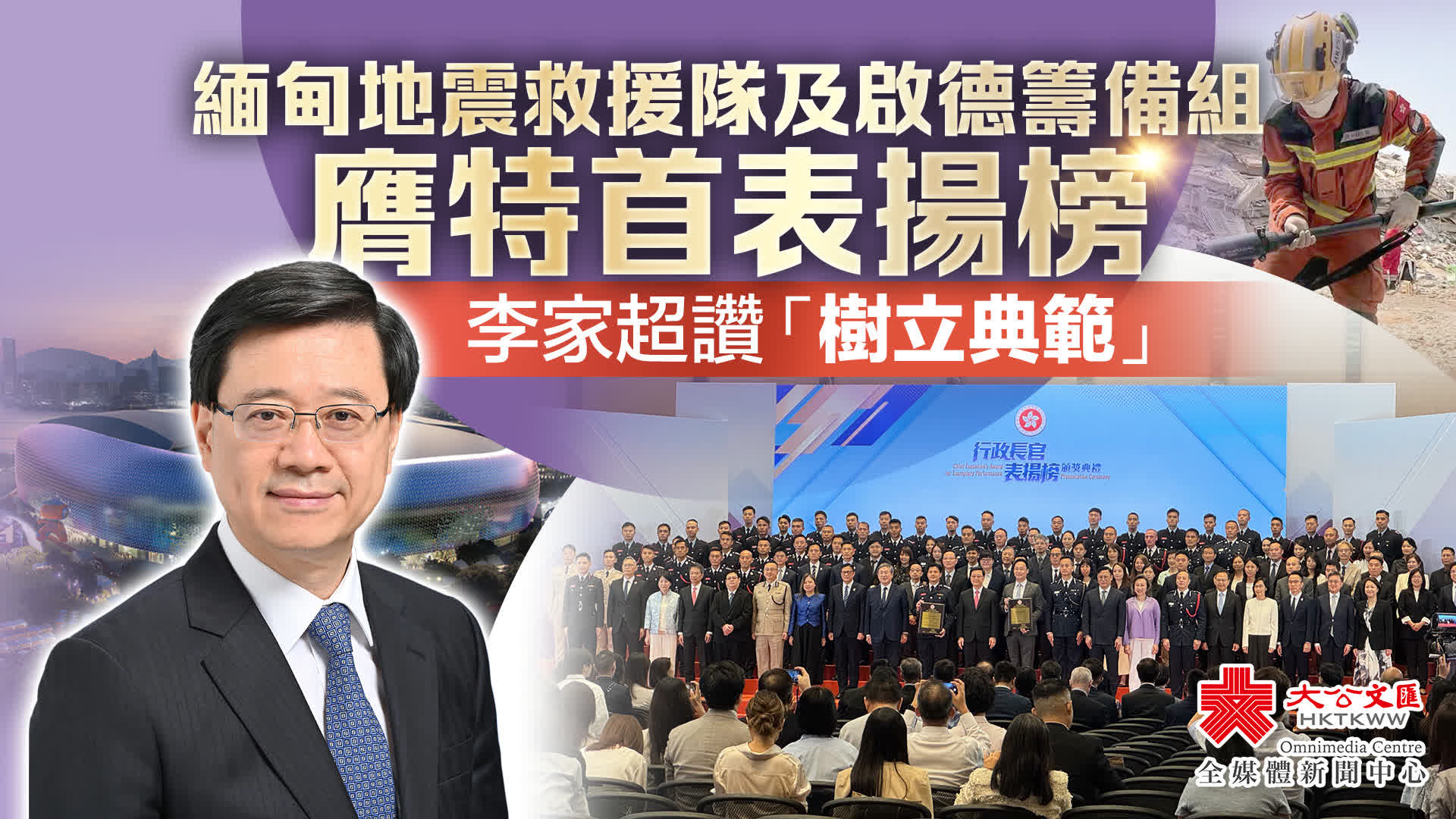 (大公文匯全媒體記者 陳子萌)行政長官李家超今日(23日)主持「行政長官表揚榜」頒獎典禮,「2025年3月前赴緬甸地震災區救援的特區救援隊」及「啟德體育園開幕跨部門籌備專組」兩組隊伍獲得表彰。