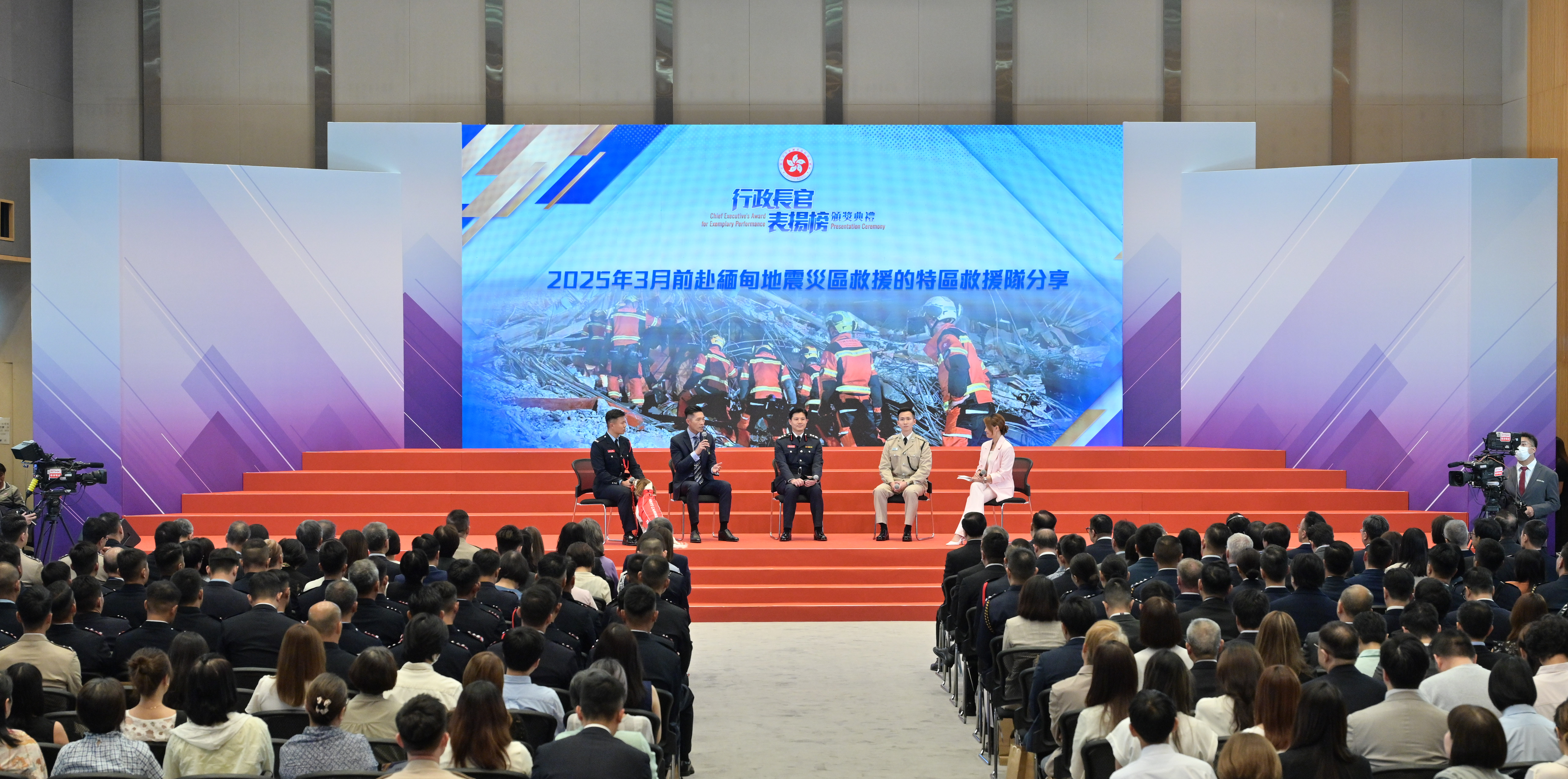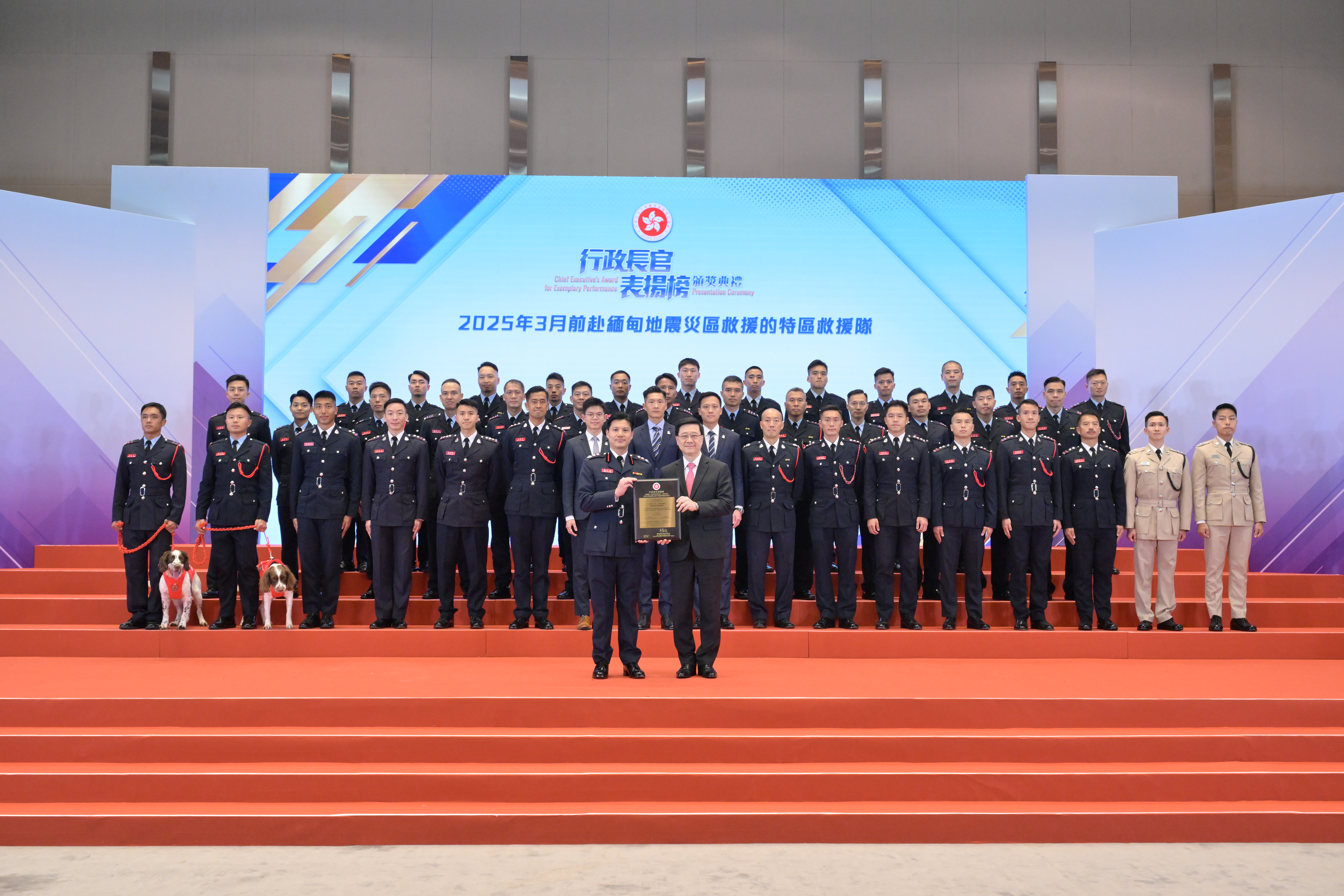 行政長官李家超七月二十三日主持「行政長官表揚榜」頒獎典禮,頒授獎狀予兩支得獎團隊——「2025年3月前赴緬甸地震災區救援的特區救援隊」(特區救援隊)和「啟德體育園開幕跨部門籌備專組」(啟德體育園開幕籌備專組)。
