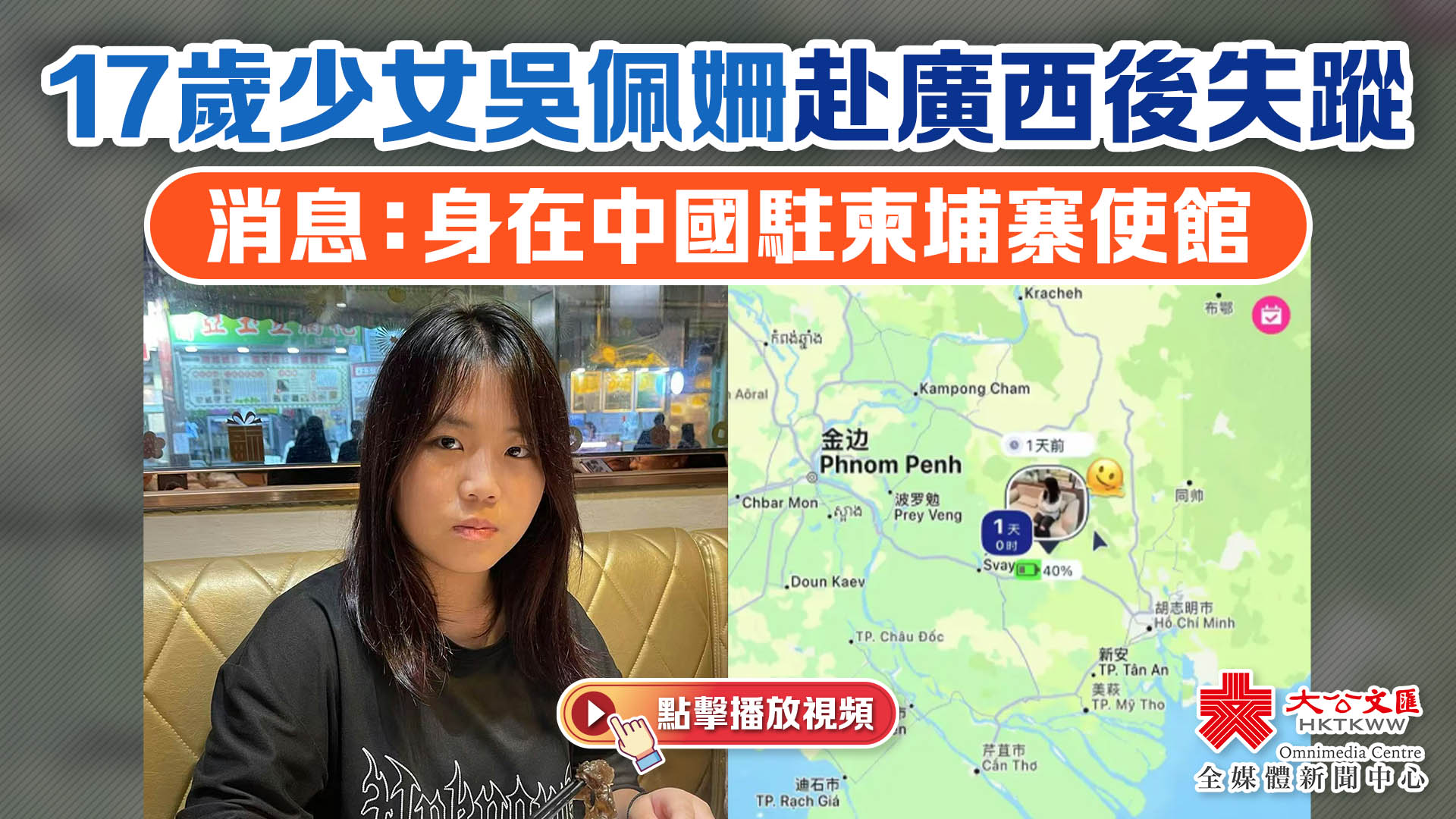 大公文匯全媒體報道,持有香港居民身份證的17歲少女吳佩姍,7月初前往廣西自治區北海市遊玩後失蹤,其手機最後定位於柬埔寨,吳父早前懸賞5000美元(折合約3.9萬港元)尋人。據傳媒報道消息指,吳佩姍已被尋回,正身在中國駐柬埔寨大使館,目前安全。