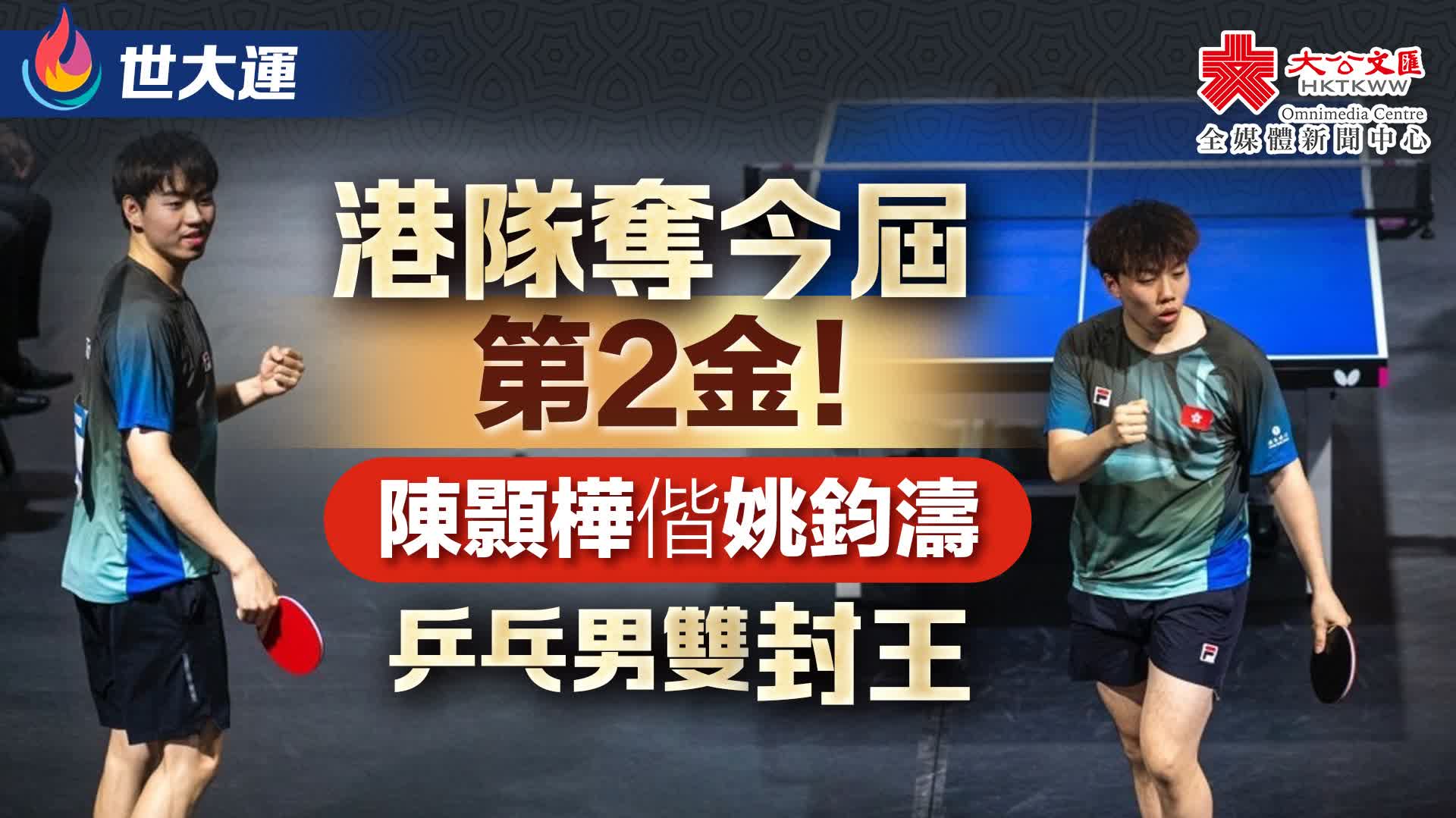大公文匯全媒體報道,世界大學生運動會,香港乒乓男雙組合陳顥樺與姚鈞濤,以局數4-1擊敗日本組合岡野俊介及谷垣佑真,勇奪金牌,為港隊帶來今屆賽事第二面金牌。