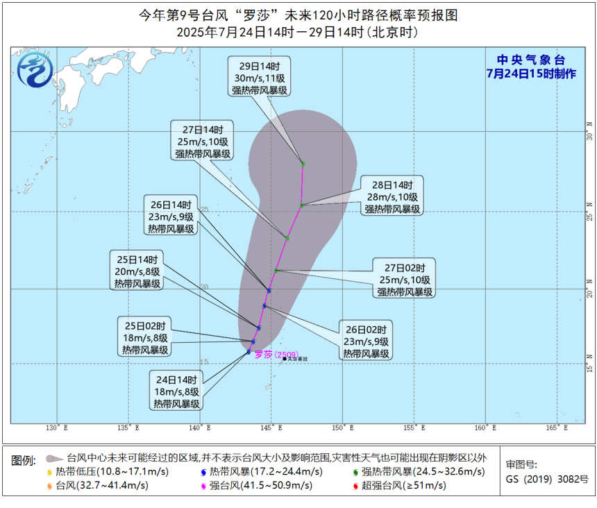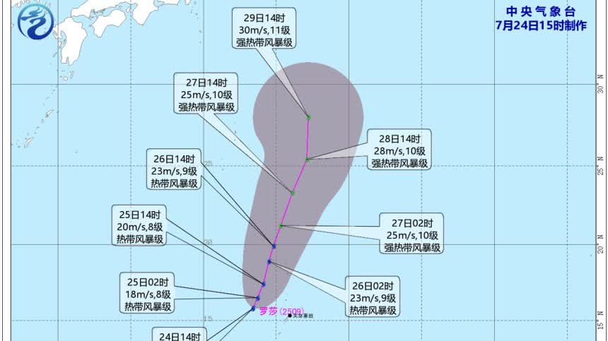 據中央氣象台消息,今年第9號颱風「羅莎」(熱帶風暴級;英文名稱:Krosa;名字來源:柬埔寨;名稱意義:鶴)已於7月24日中午在西北太平洋洋面上生成,下午2點鐘其中心位於塞班島西偏北方向約260公里的海面上,就是北緯15.8度、東經143.4度,8級(18米/秒),998百帕,7級風圈半徑為160~260公里。預計,「羅莎」將以每小時5~10公里的速度向北偏東方向移動,強度逐漸增強。未來「羅莎」對我國近海海域無影響。