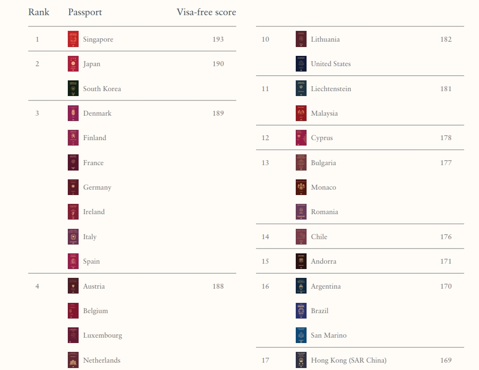 歐洲護照排名表現依然強勁,榜單排名第3與第4有多個歐洲國家並列,其中7個歐盟成員國的護照並列第三,包括法國、德國、意大利和西班牙等,均可免簽證進入189個地方。
