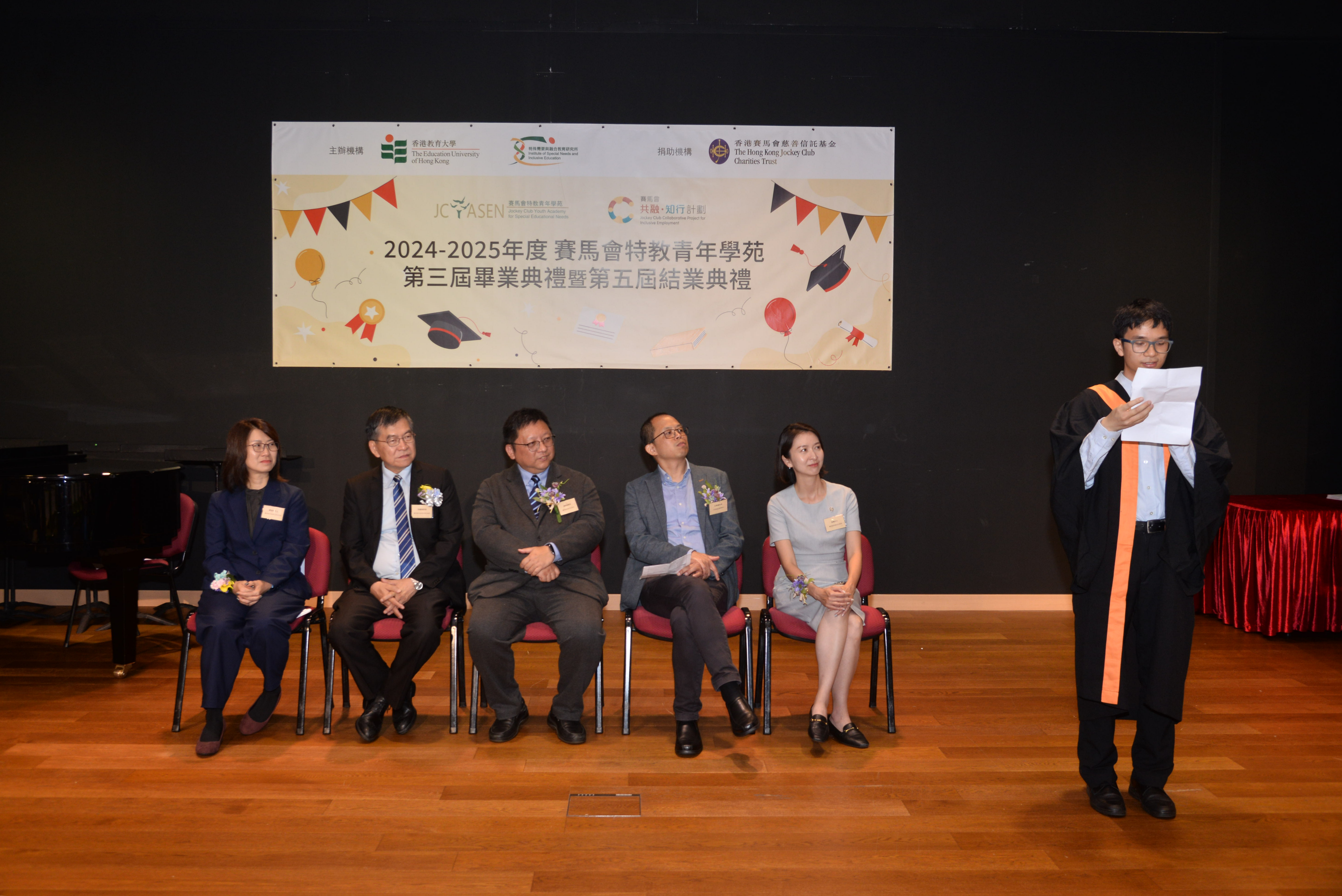 畢業典禮由勞工及福利局康復專員陳偉偉先生、教大校長及教育發展與創新學院院長李子建教授、教大特殊需要與融合教育研究所執行所長及學苑總監冼權鋒教授,香港賽馬會慈善事務顧問李綸女士以及香港特殊學校議會副主席石偉強校長擔任主禮嘉賓 。超過 200名參加者,包括中學校長、前線教師、學苑課程導師、合作企業及非牟利機構代表、學員及其家長出席畢業典禮。在典禮上,第三屆畢業的學員、校友、他們的僱主及教大準老師,亦分享了他們的學習經歷。