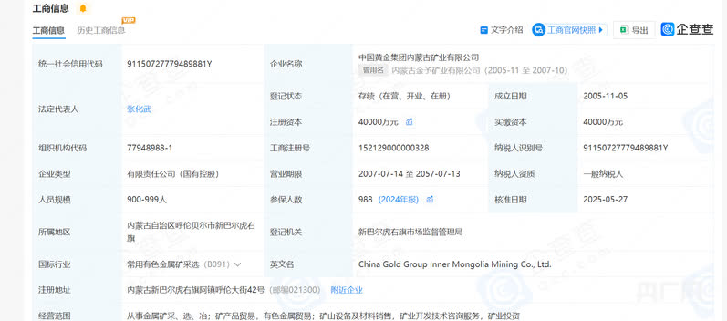 企查查信息顯示,中金內蒙古礦業成立於2005年11月,經營範圍包括礦山設備及材料銷售、礦業開發技術諮詢服務、礦業投資等。據企查查信息顯示,2021年,呼倫貝爾市應急管理局對中金內蒙古礦業實施檢查,發現隱患27條。