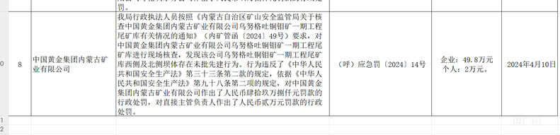 而據呼倫貝爾市應急管理局《2024年非煤礦山領域行政處罰公示表》內容,該局行政執法人員按照《內蒙古自治區礦山安全監管局關於核查中國黃金集團內蒙古礦業有限公司烏努格吐銅鉬礦一期工程尾礦庫有關情況的通知》(內礦管函〔2024〕49號)要求,對中國黃金集團內蒙古礦業有限公司烏努格吐銅鉬礦一期工程尾礦庫進行現場核查,發現該公司烏努格吐銅鉬礦一期工程尾礦庫西側及北側壩體存在未批先建行為。行為違反了《中華人民共和國安全生產法》第三十三條第二款的規定,依據《中華人民共和國安全生產法》第九十八條第二項的規定,對中國黃金集團內蒙古礦業有限公司作出了人民幣肆拾玖萬捌仟元罰款的行政處罰,對直接主管負責人作出了人民幣貳萬元罰款的行政處罰。