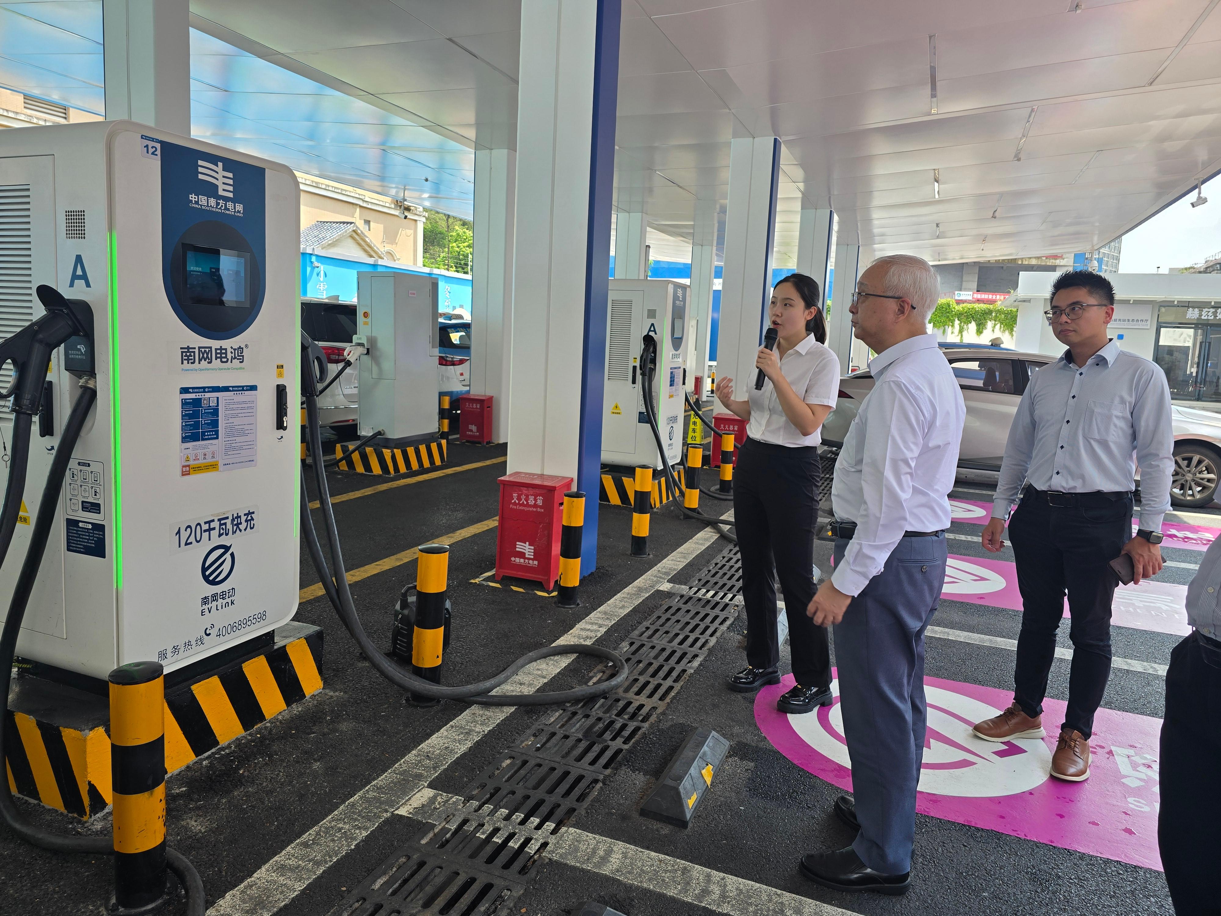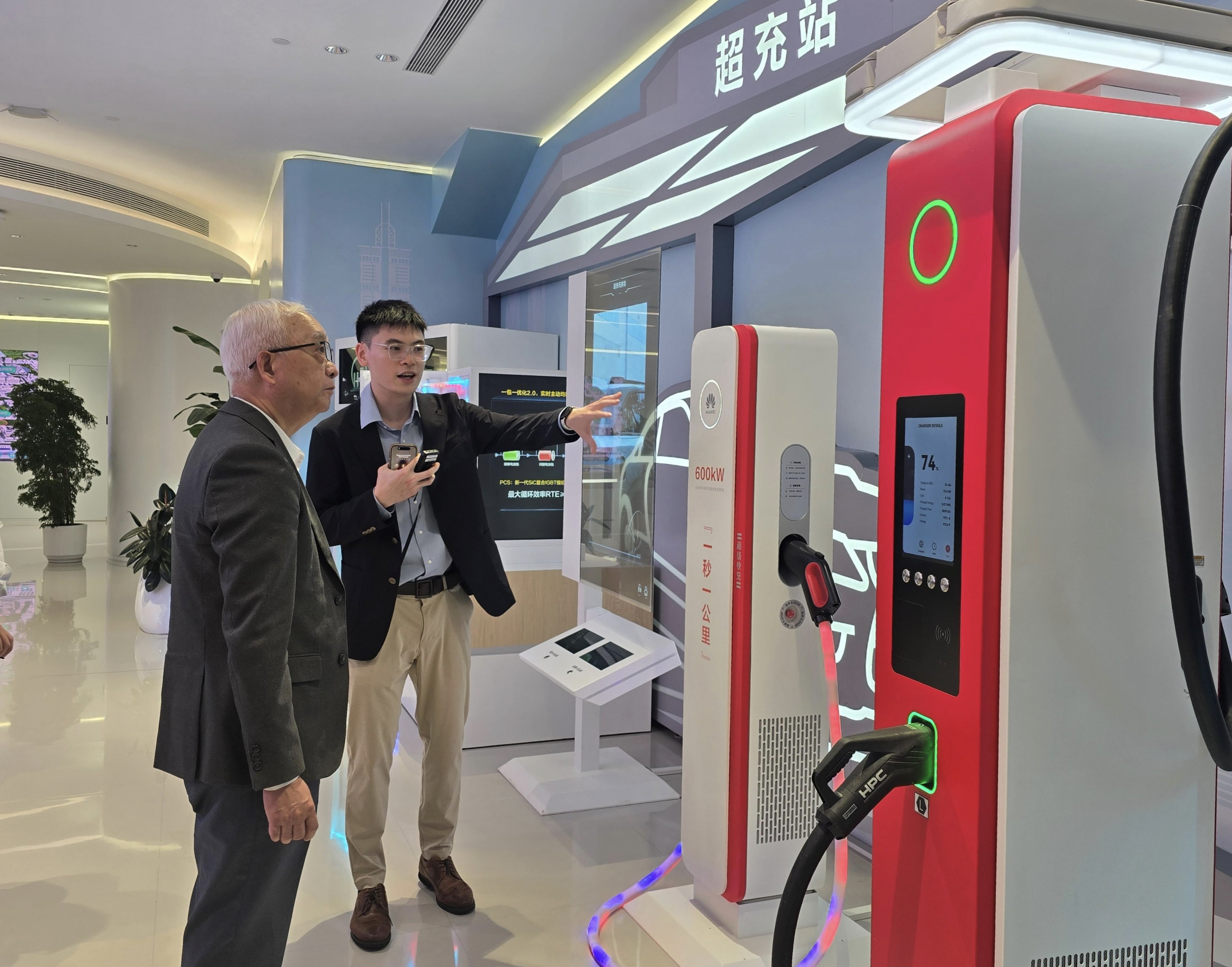 下午,謝展寰考察蓮花山超級充電站。該處為集合「光儲超充、車網互動」於一體的公共超充示範站,最大充電功率達600千瓦,並支持大功率向電網反向放電。