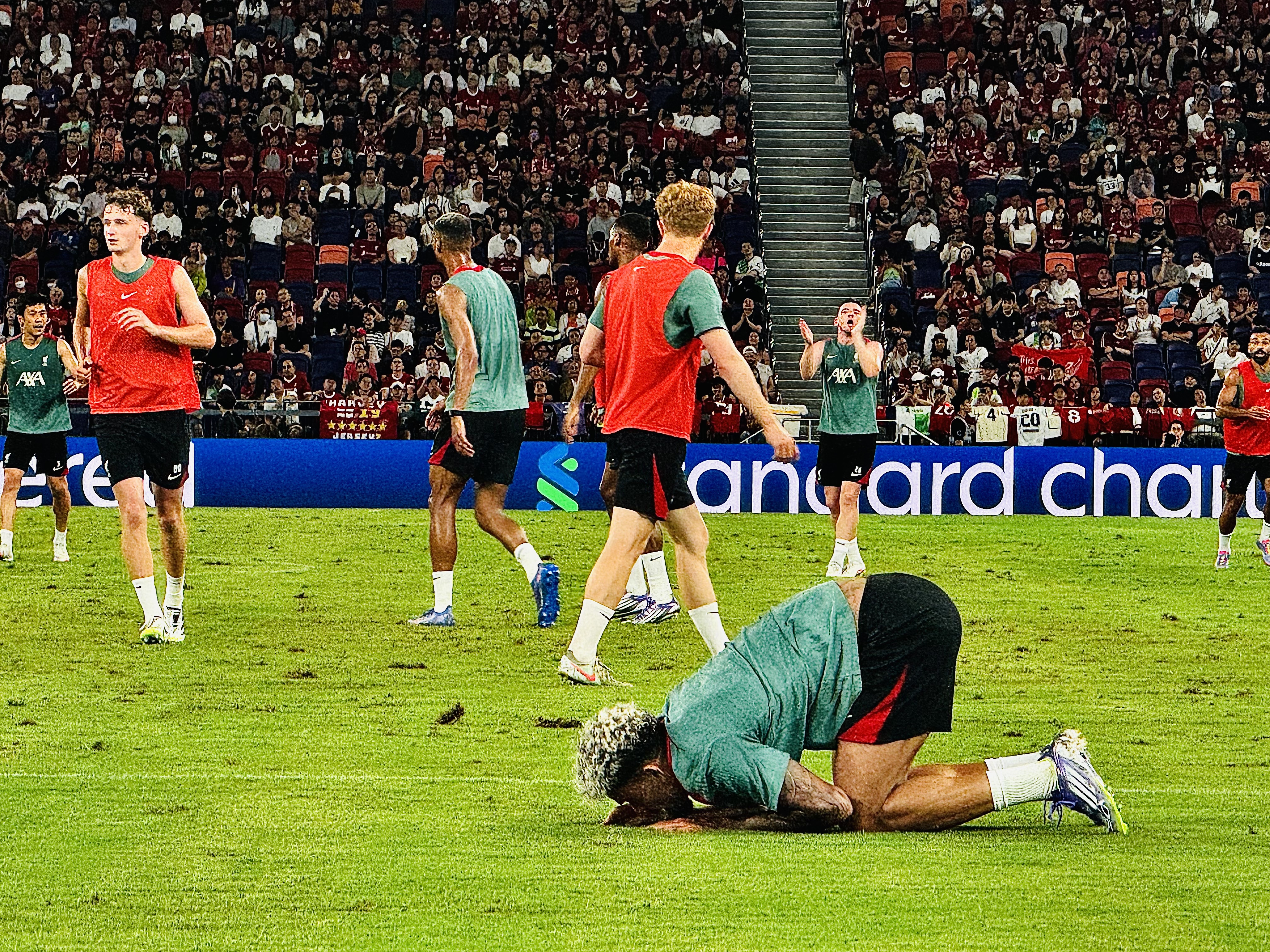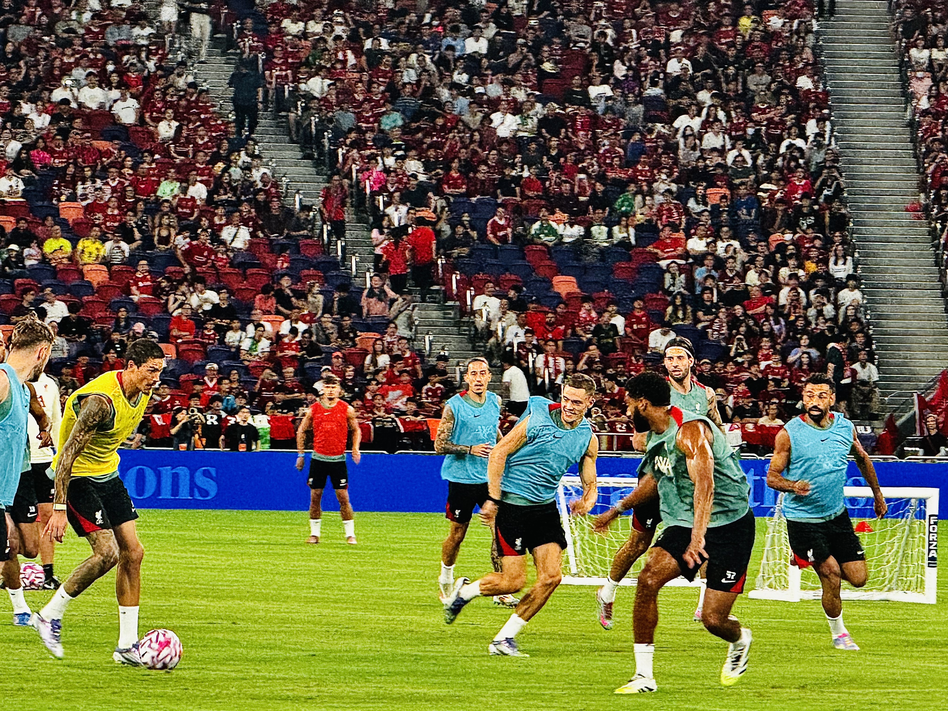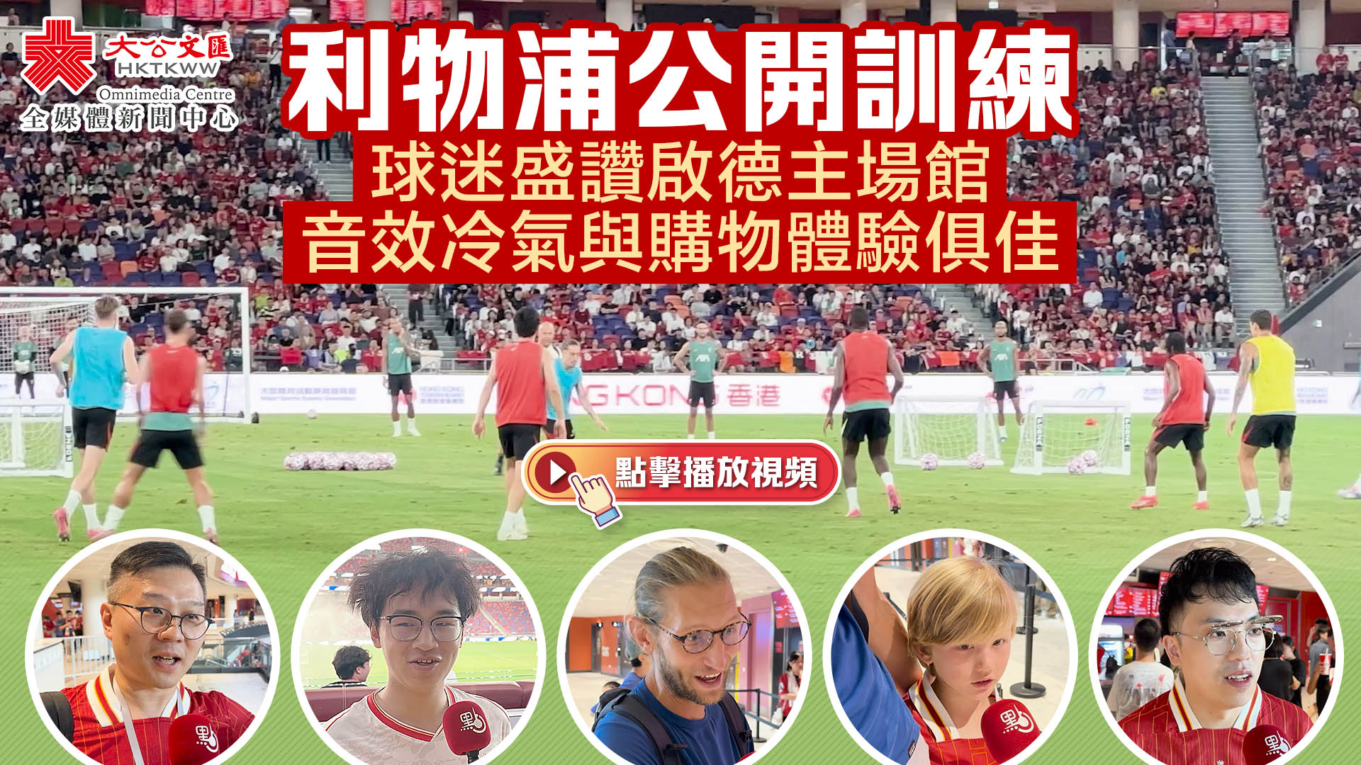 (大公文匯全媒體記者 周傾芫 報道)「香港足球盛會2025」將於本周末在啟德主場館揭幕。四大歐洲豪門利物浦、AC米蘭、阿仙奴及熱刺的到來讓全港球迷沸騰。今日(24日)下午5時,利物浦率先在啟德主場館展開公開訓練,儘管非正式比賽,現場仍湧入不少身穿紅色球衣的球迷,歡呼聲與掌聲貫穿全程,提前上演了一場「英超狂熱」。