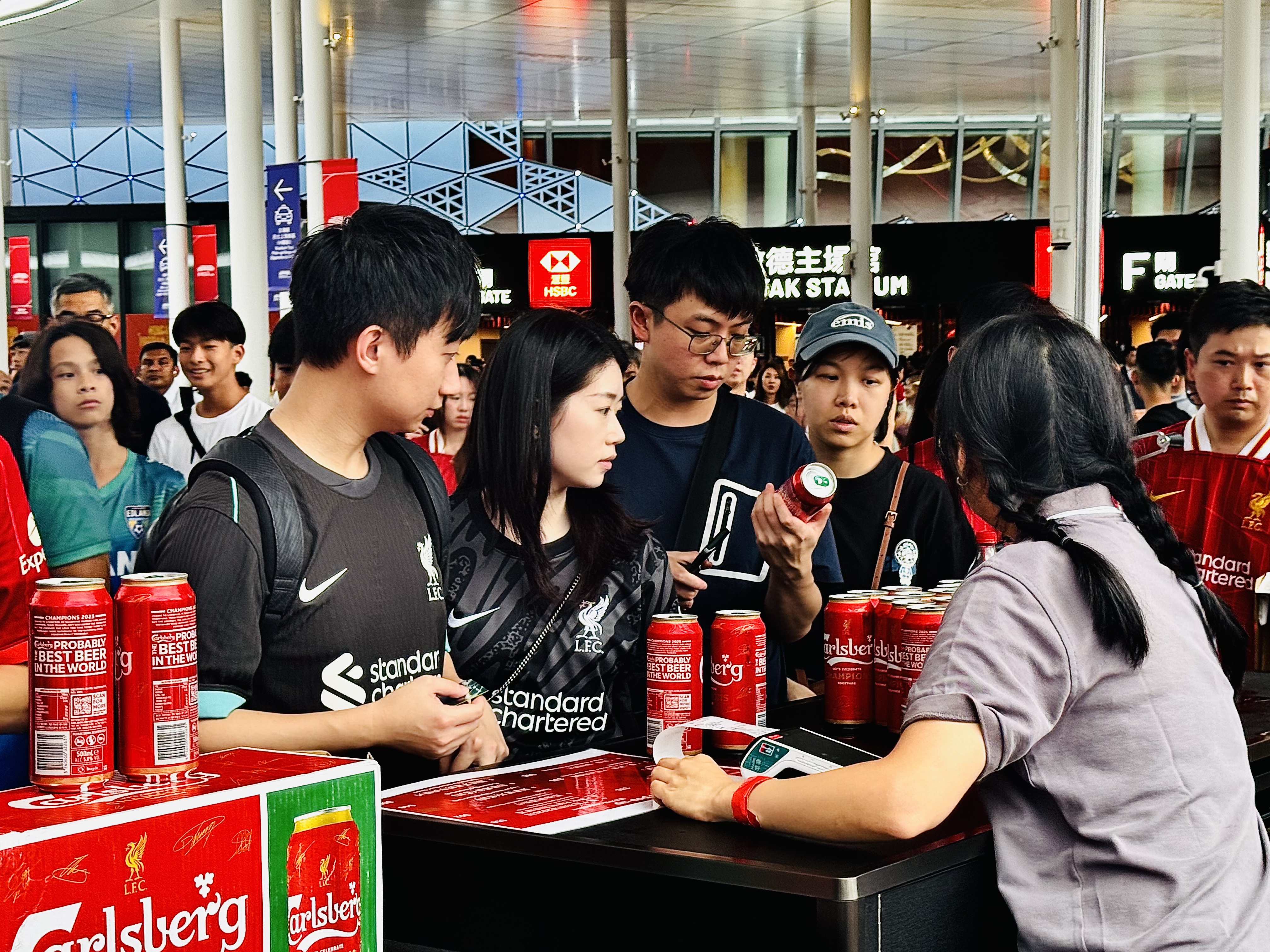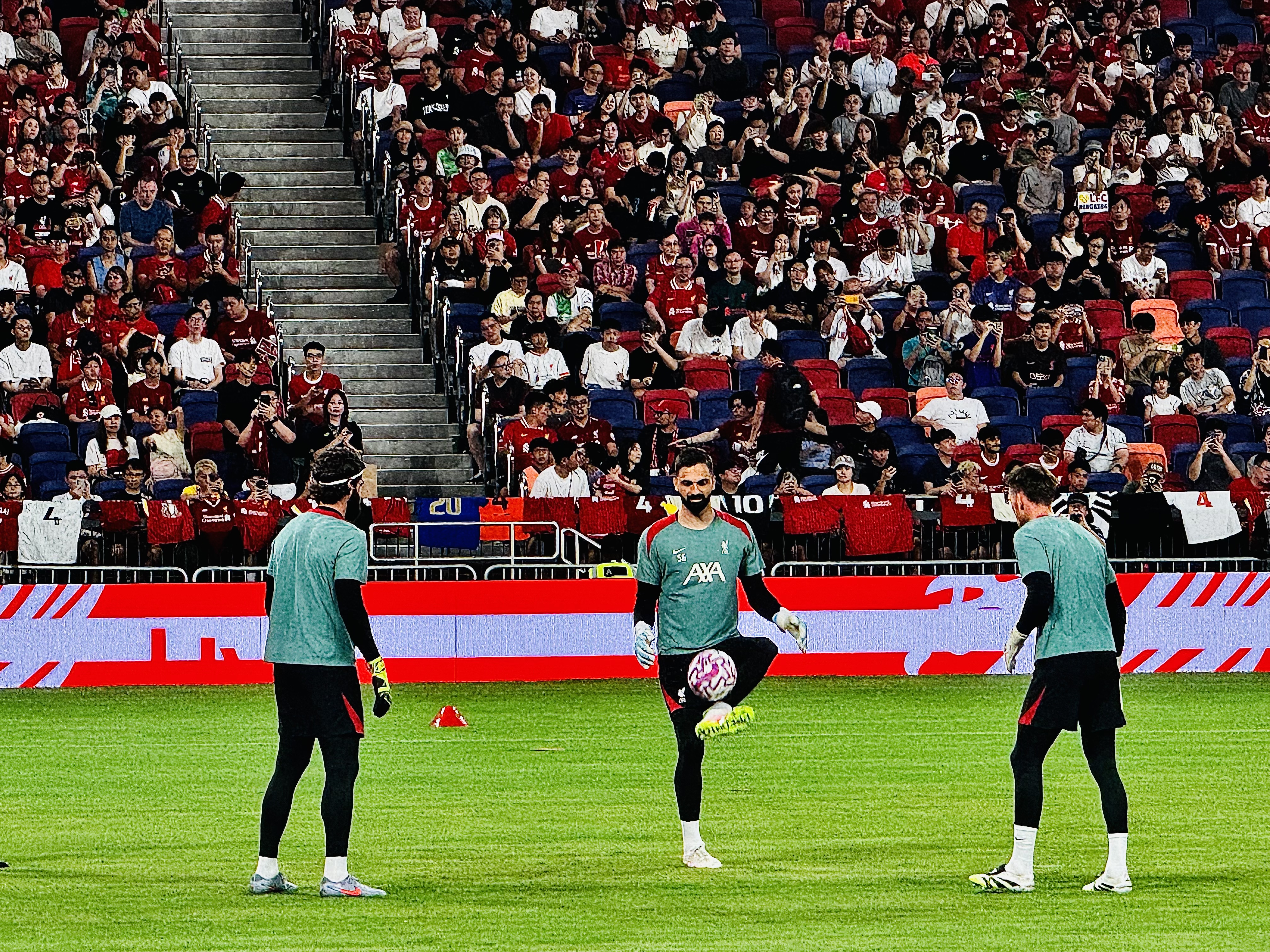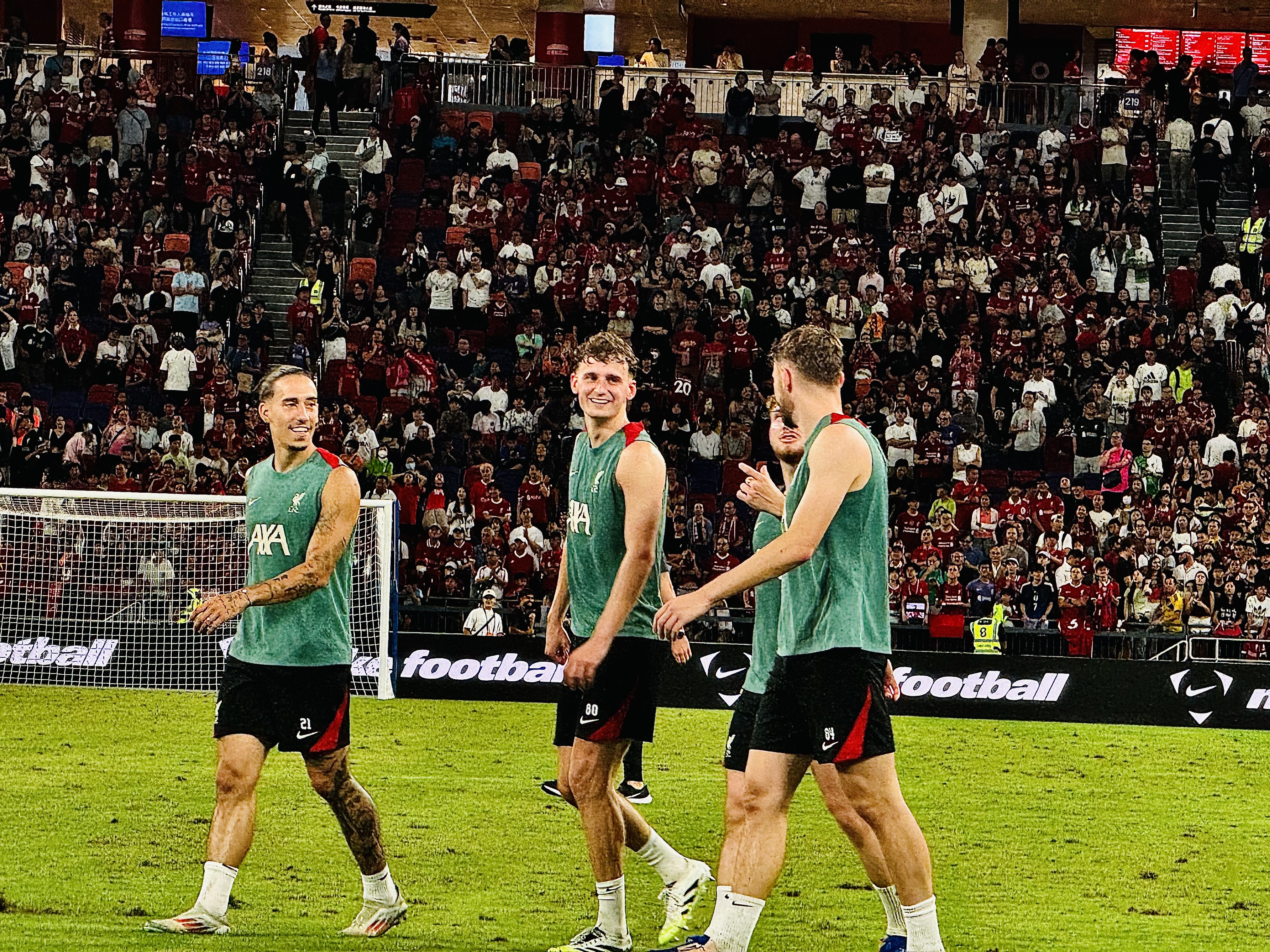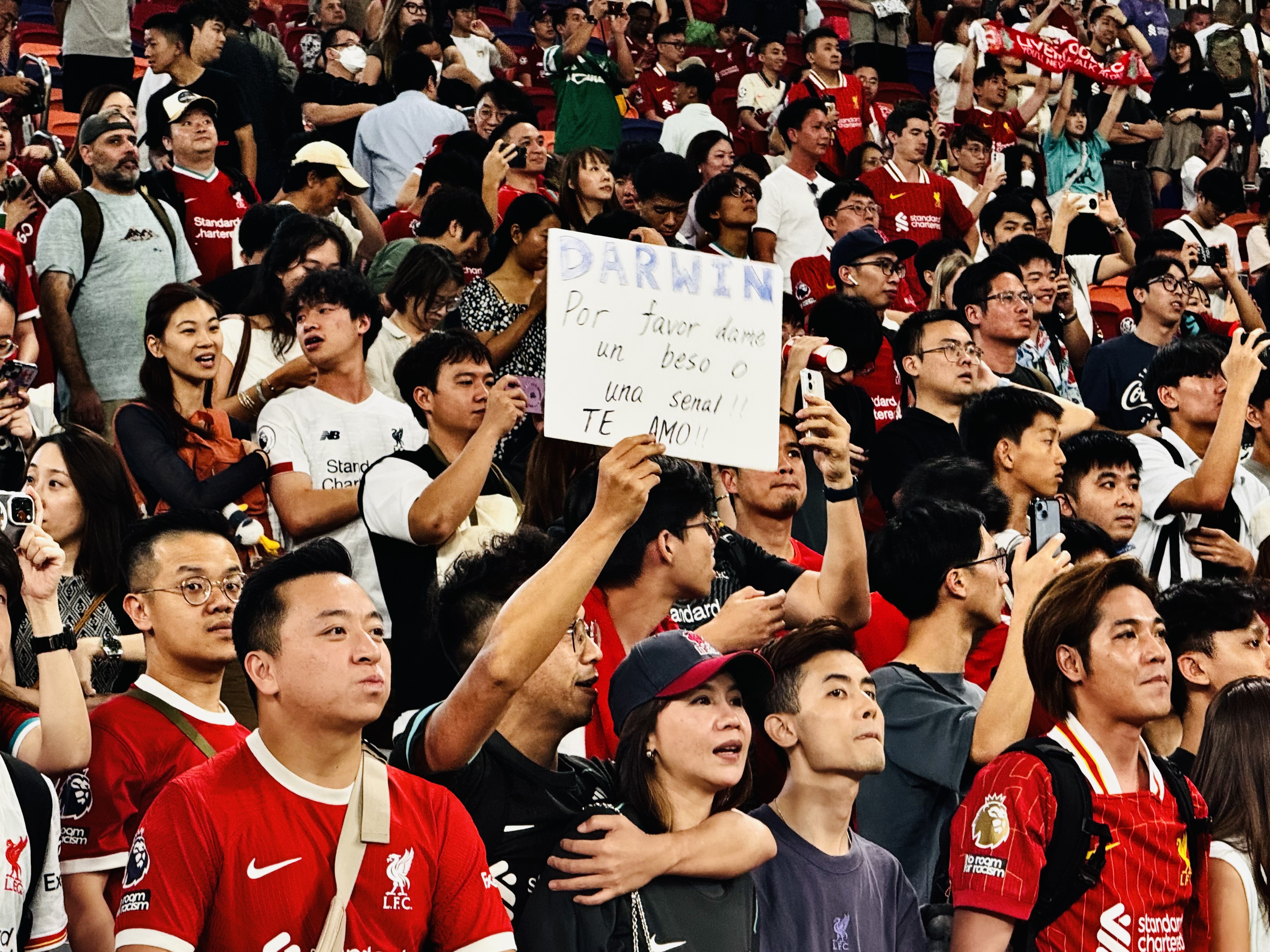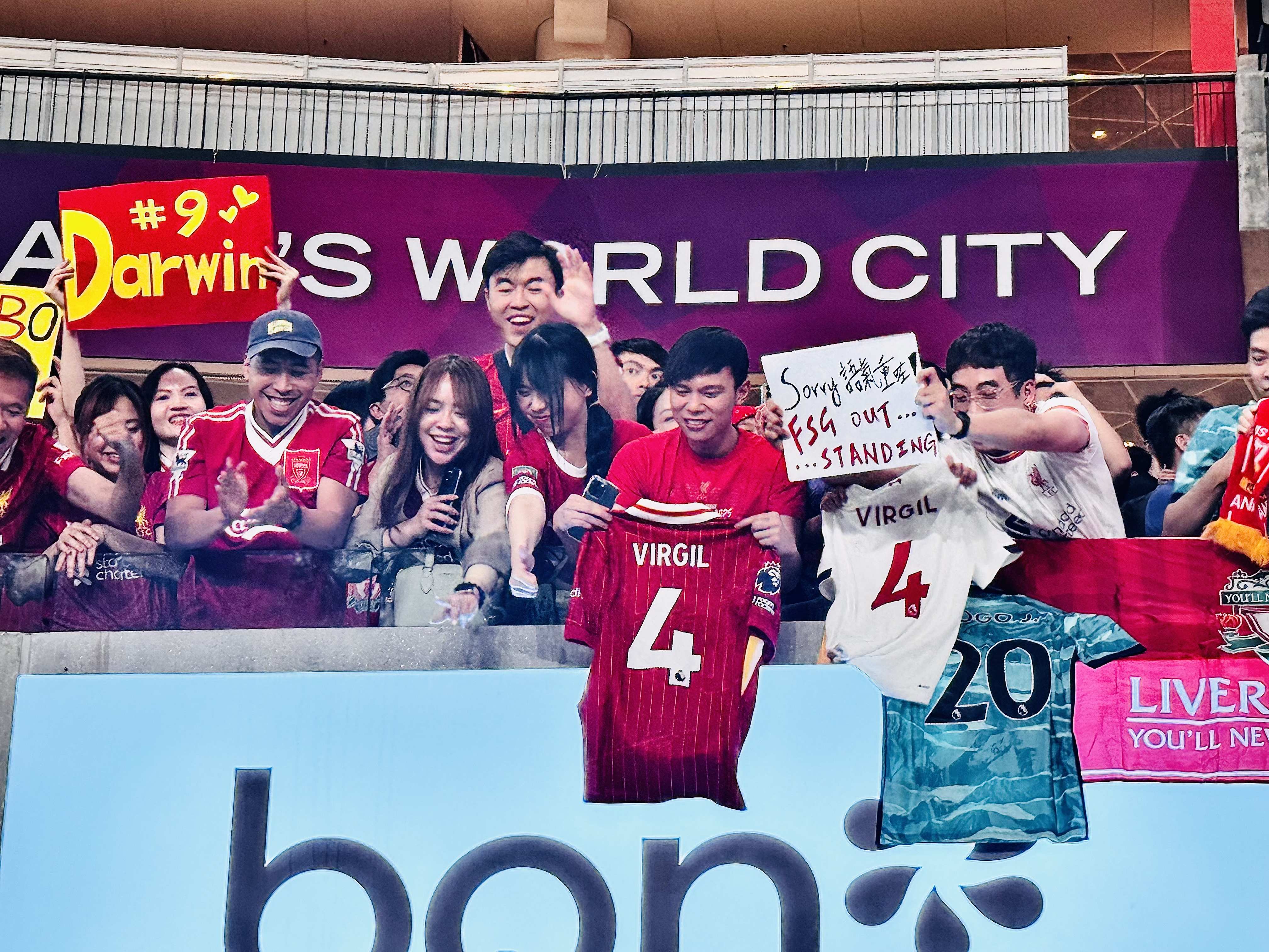 專程從北京飛來的金先生則是新晉球迷代表,雖然2022年才「入坑」,但真的很愛。他豪擲5000元成本追星,直言「絕對值得」。金先生稱讚整個場館豪華又舒適,並表示「國際俱樂部多來中國絕對能提升足球氛圍!」他用英語向球員們表達鼓勵,「We can achieve it in the next season!The Liverpool will be greater!」他最愛的球員是麥卡利斯特。
