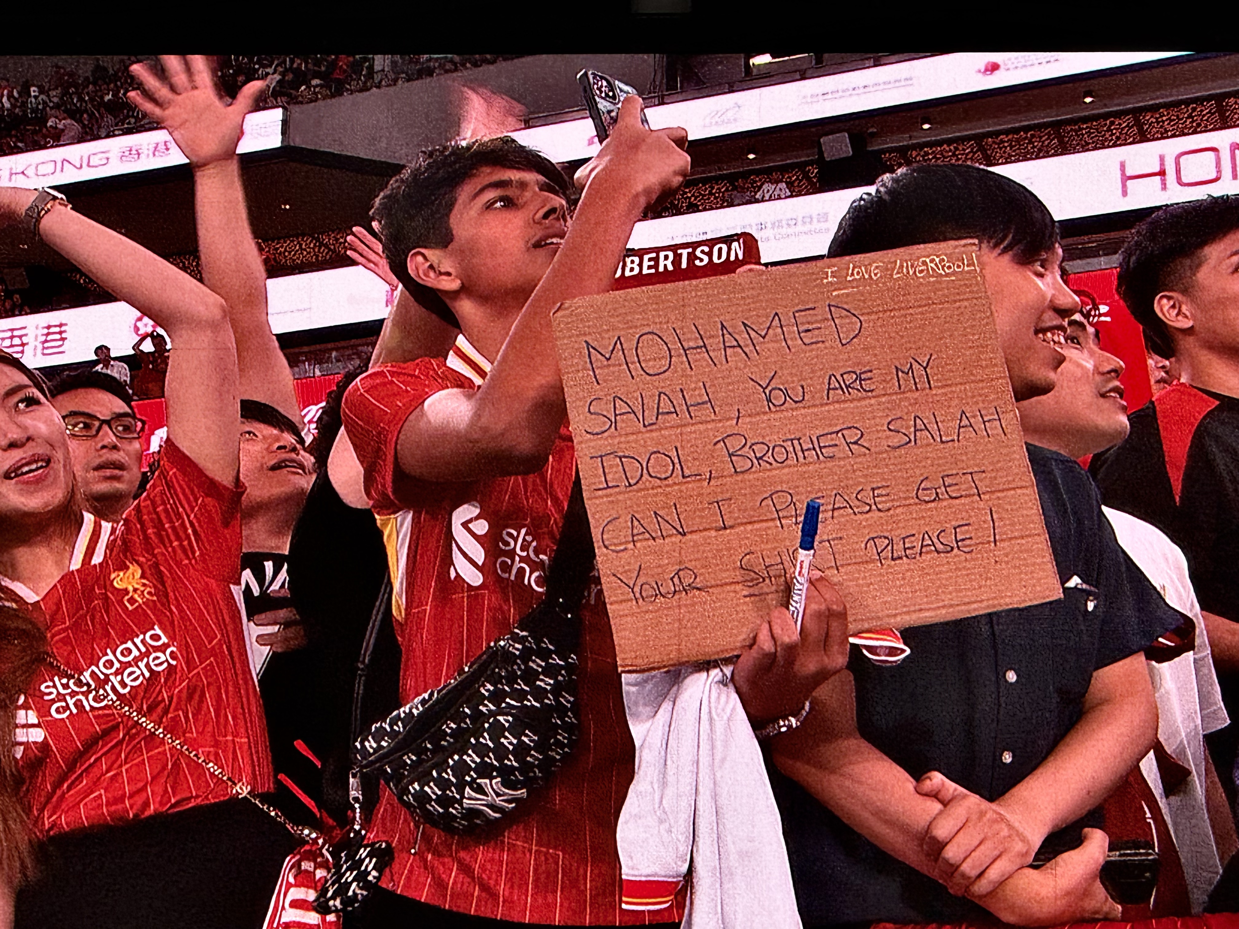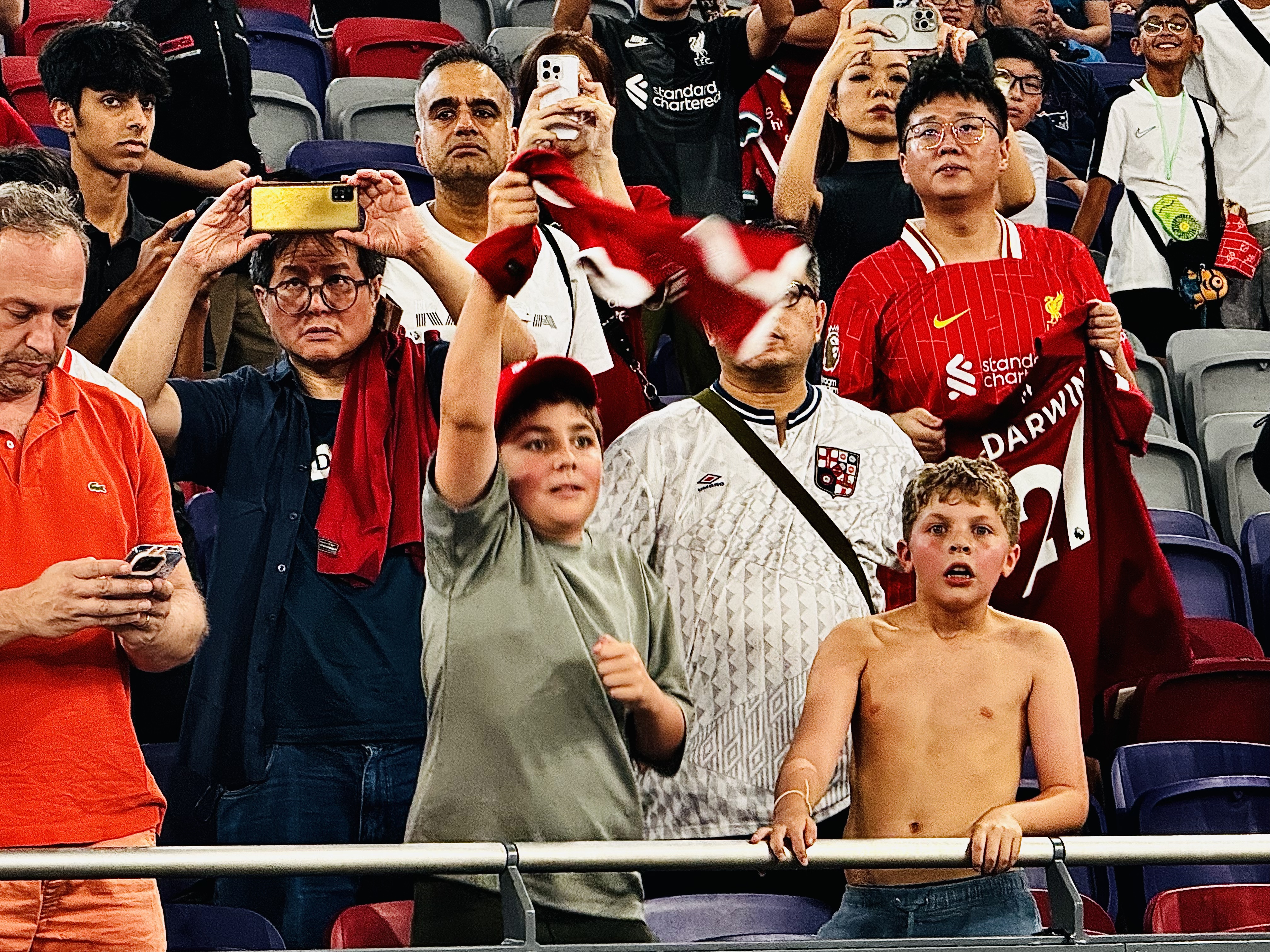 父子檔球迷隨處可見。10歲鄭小朋友高舉沙拿自傳,自爆已做5年球迷。父親鄭先生回憶:「2017年利物浦來港時,兒子才2歲,現在終於能帶他親身體驗球賽。」英國籍爸爸Will已是第三次造訪啟德體育園,他說:「七欖賽、Coldplay演唱會都在這兒看過,這個體育館完美融合傳統與現代——在英國都很少見!」能夠看到家鄉球隊在眼前揮灑汗水,他的自豪感溢於言表。6歲的小粉絲Alfie用稚嫩的聲音表達,「我是從今年開始支持他們,最喜歡沙拿」。