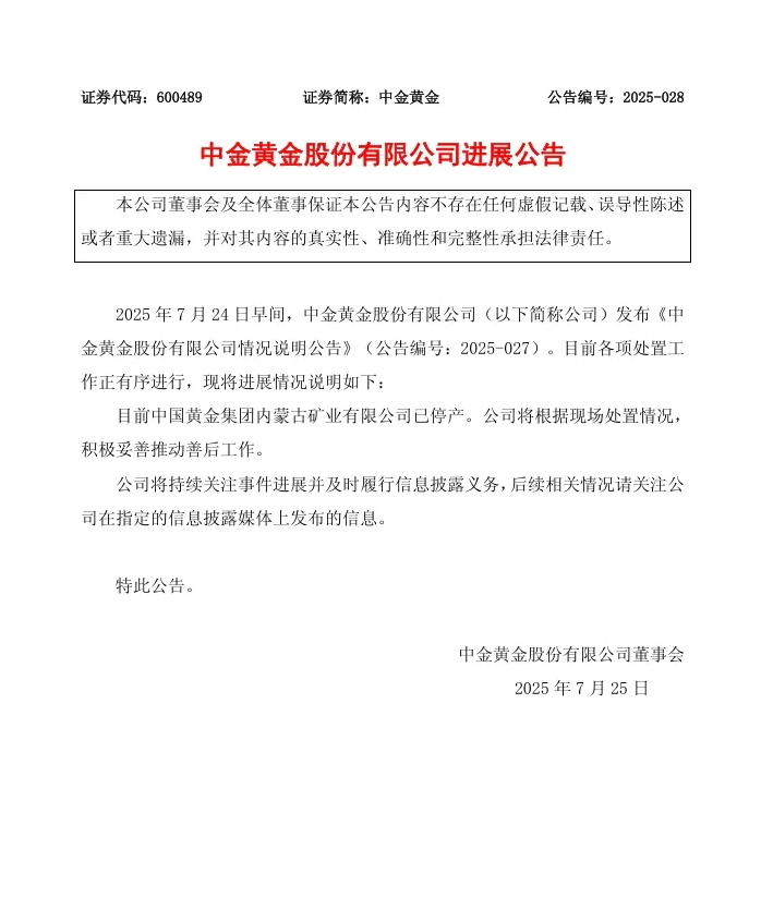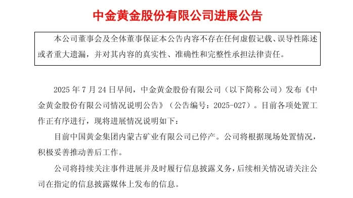 2025年7月24日早間,中金黃金股份有限公司(以下簡稱公司)發布《中金黃金股份有限公司情況說明公告》(公告編號:2025-027)。目前各項處置工作正有序進行,現將進展情況說明如下: