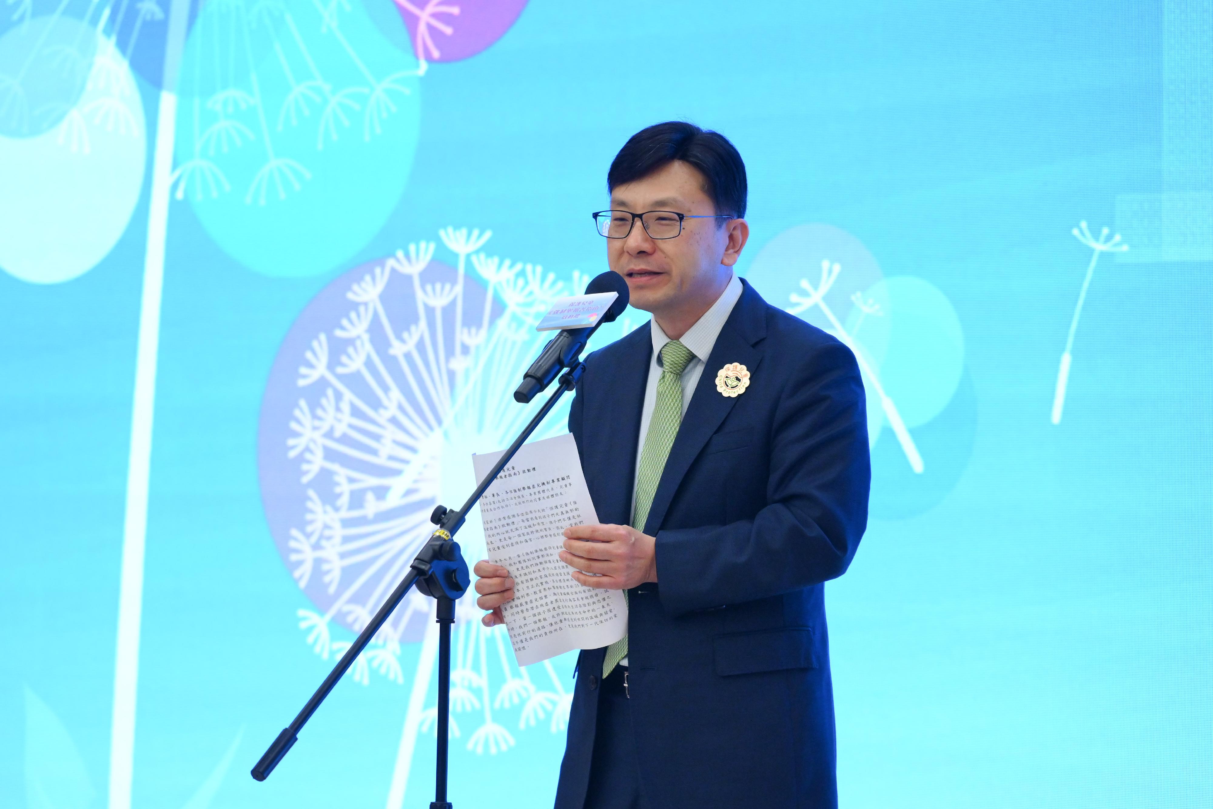 勞工及福利局局長孫玉菡今日(七月二十四日)主持保護兒童—《強制舉報者指南》(《指南》)啟動禮,宣布供強制舉報者參考的《指南》正式推出。圖示社會福利署署長杜永恒在啟動禮上致辭。