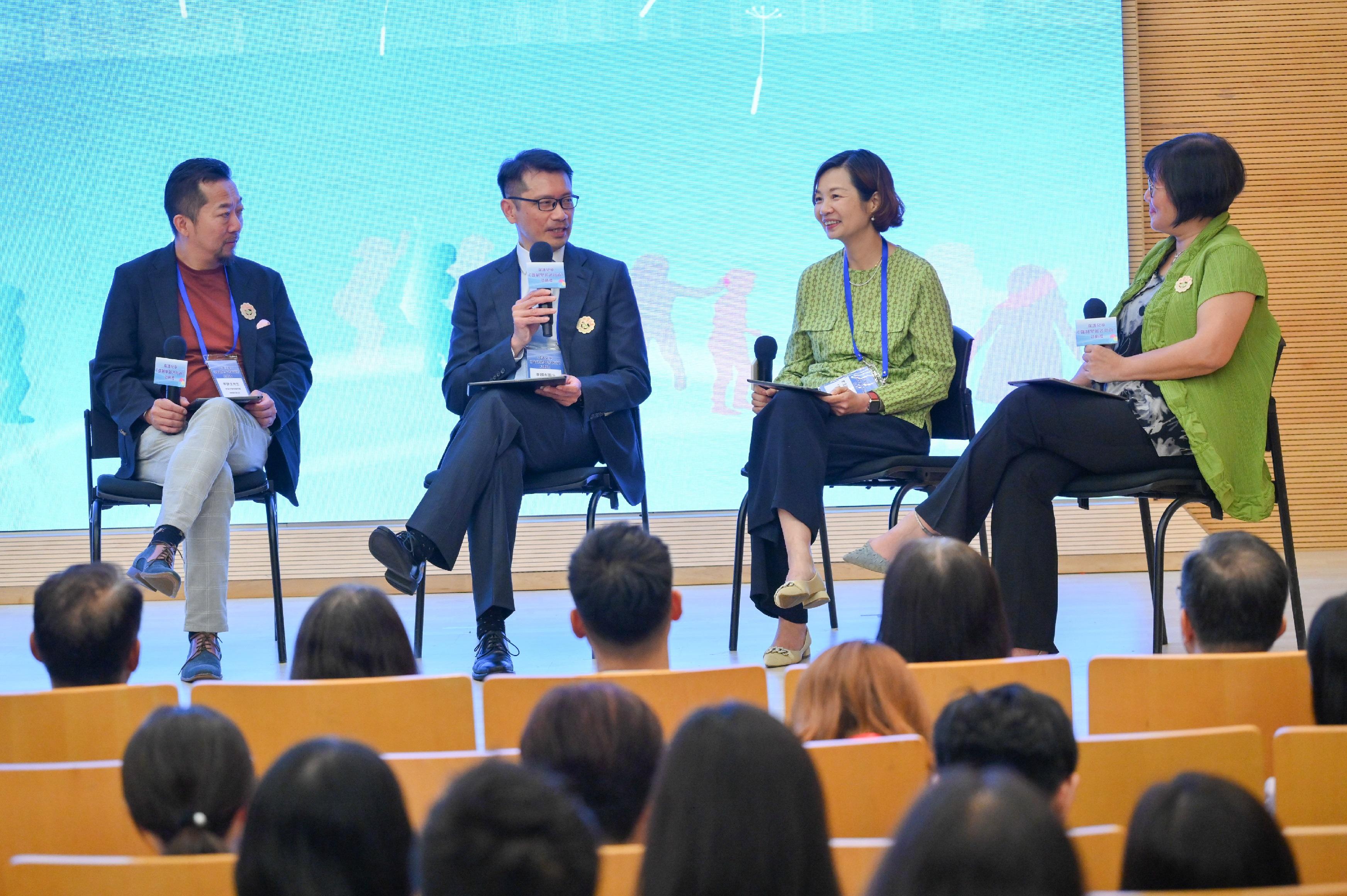 勞工及福利局局長孫玉菡今日(七月二十四日)主持保護兒童—《強制舉報者指南》(《指南》)啟動禮,宣布供強制舉報者參考的《指南》正式推出。圖示社會福利署助理署長(家庭及兒童福利)鄒鳳梅(右一)邀請三位分別來自社會福利界、教育界及醫療衞生界的專業顧問團代表成員分享參與制定《指南》的感受。