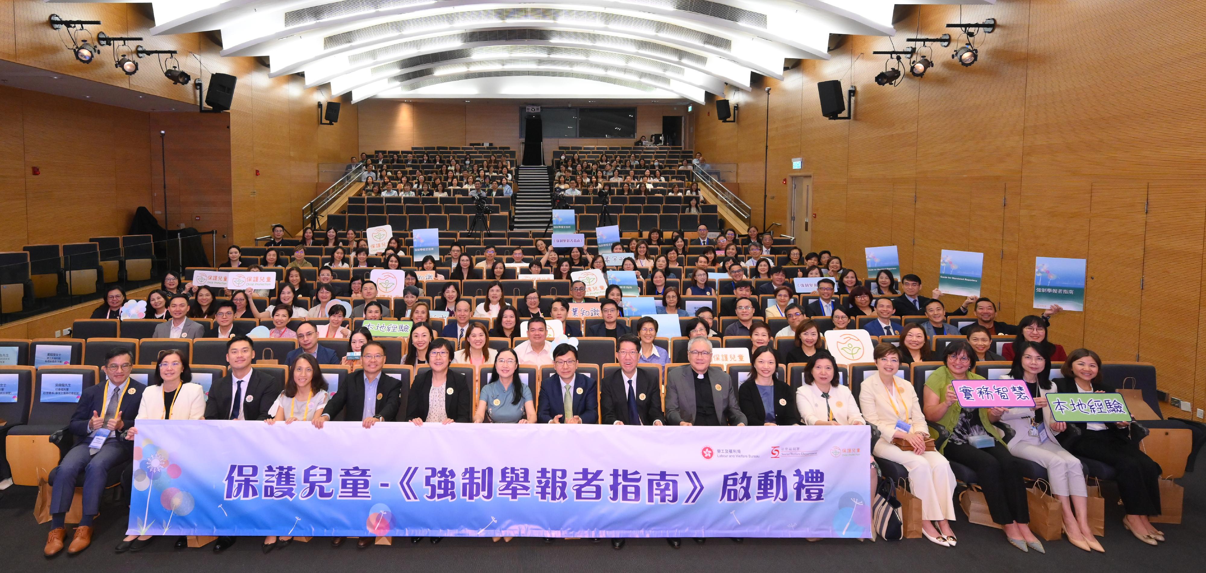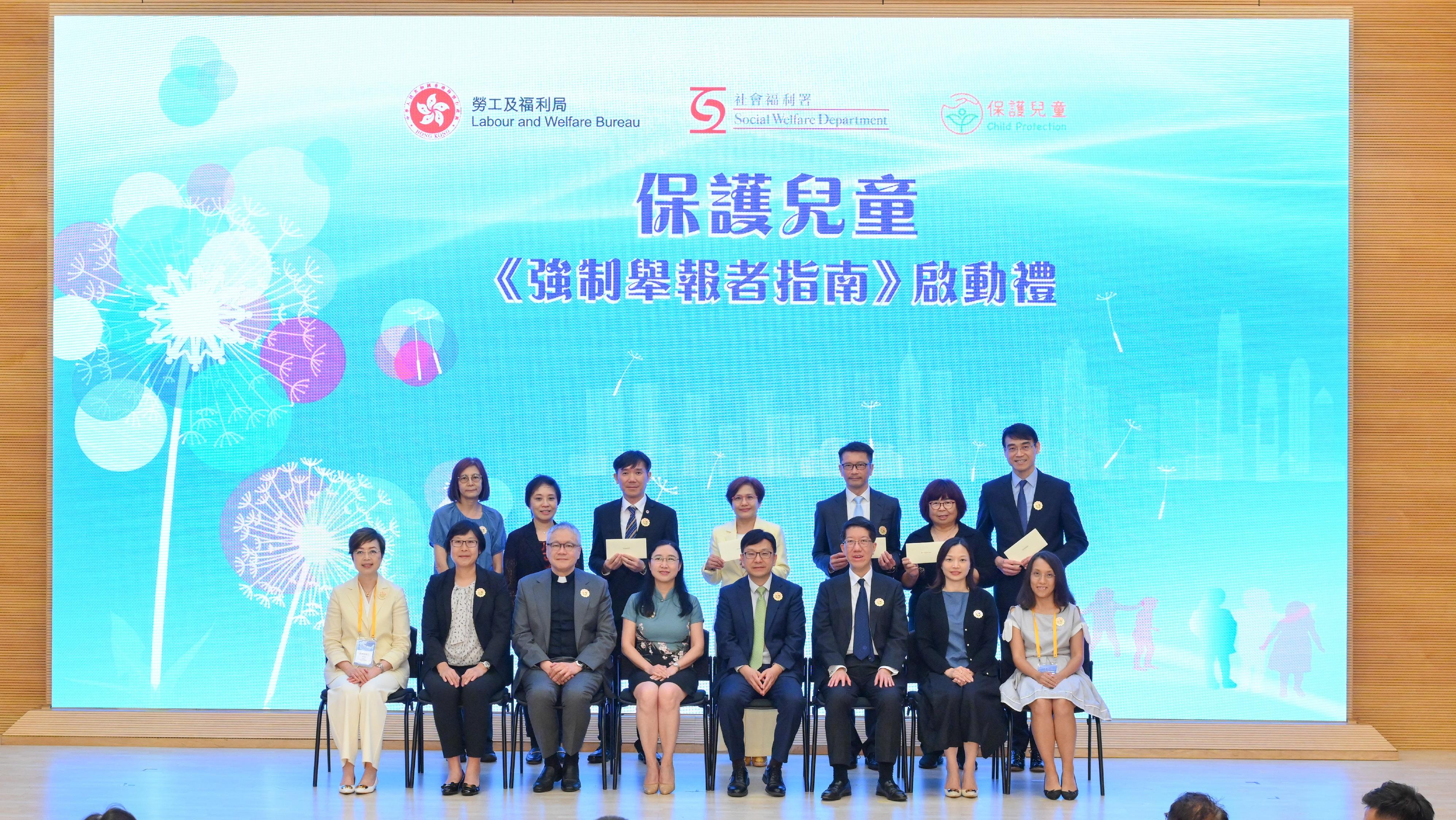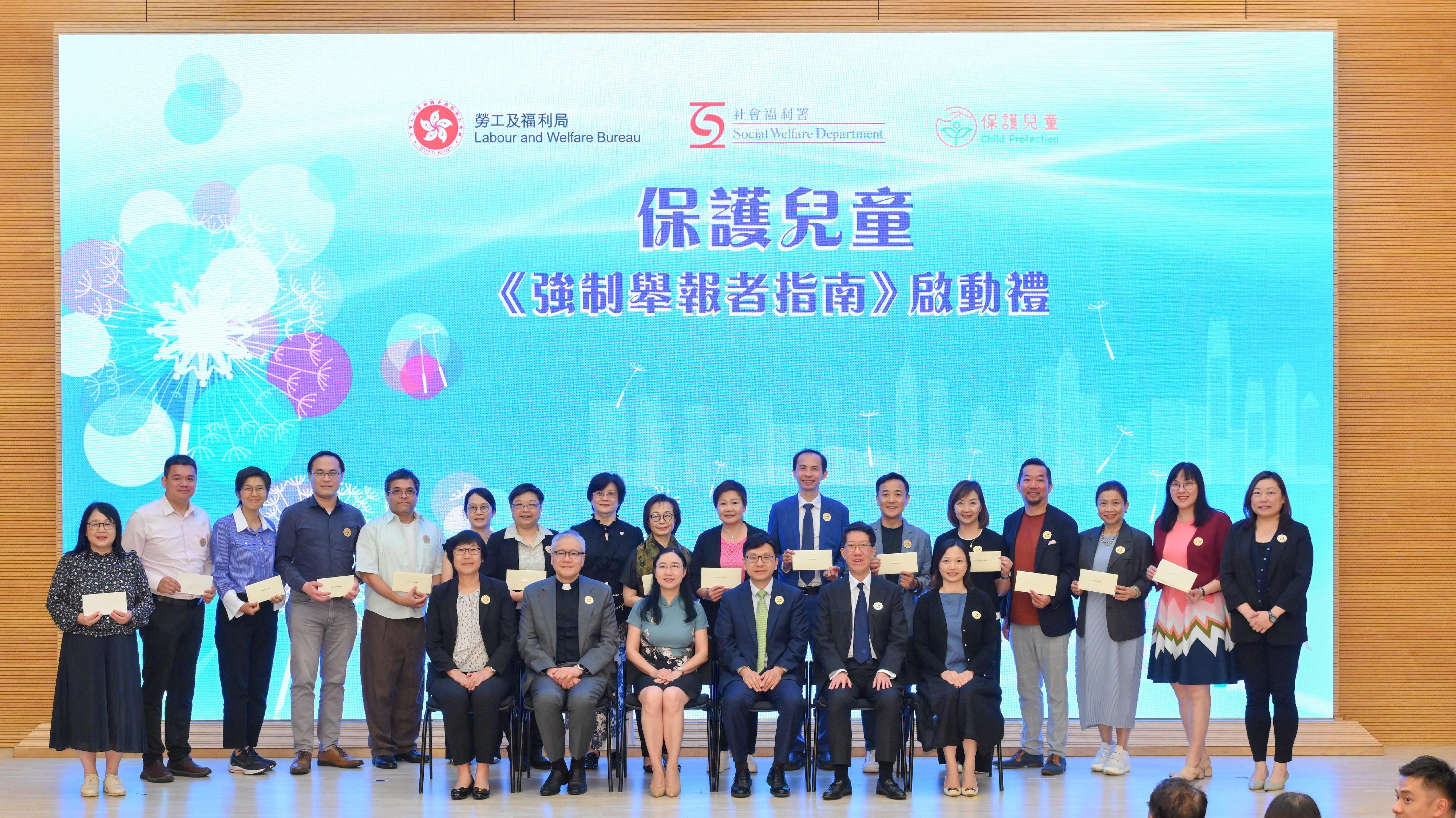 勞工及福利局(勞福局)局長孫玉菡今日(七月二十四日)主持保護兒童—《強制舉報者指南》(《指南》)啟動禮,宣布供強制舉報者參考的《指南》正式推出。圖示孫玉菡(第一排左八)、勞福局常任秘書長劉焱(第一排左七)、社會福利署署長杜永恒(第一排右八)、立法會福利事務委員會主席管浩鳴(第一排右七)、警務處助理處長(刑事)鍾詠敏(第一排左六)、署理教育局首席助理秘書長(特殊教育)陳潔玲(第一排右六)與其他嘉賓合照。