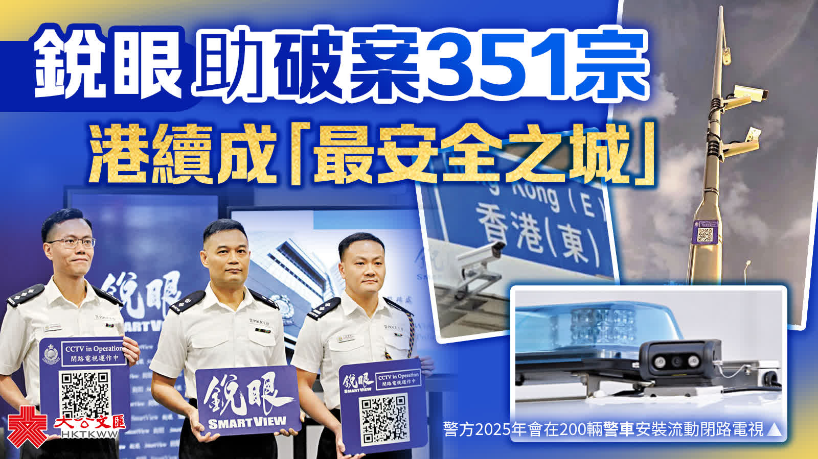(香港文匯報 記者 曾立本)打擊罪案,天眼屢建奇功。香港特區政府的銳眼計劃,於去年4月至今年7月23日在全港各區安裝3,162個閉路電視鏡頭,截至上月30日的一年多內,協助警方偵破351宗案件,拘捕628人,其中3宗兇殺案於8小時內破案。為進一步強化銳眼對預防、偵查罪案確保公共安全的功能,香港警方目標於2027年底在全港安裝不少於1.5萬個鏡頭,並將銳眼覆蓋版圖擴展,將運輸署、房屋署、康文署以及港鐵公屬的閉路電視影像接入銳眼系統內,今年更在200輛警車安裝流動閉路電視(見另稿)。警務處強調,相關操作完全符合私隱等法律要求,會運用數碼屏蔽技術將私人地方徹底遮蓋。未來研究人臉識別技術的合規應用,大幅提升警政效益,使香港繼續成為全球最安全的城市之一。