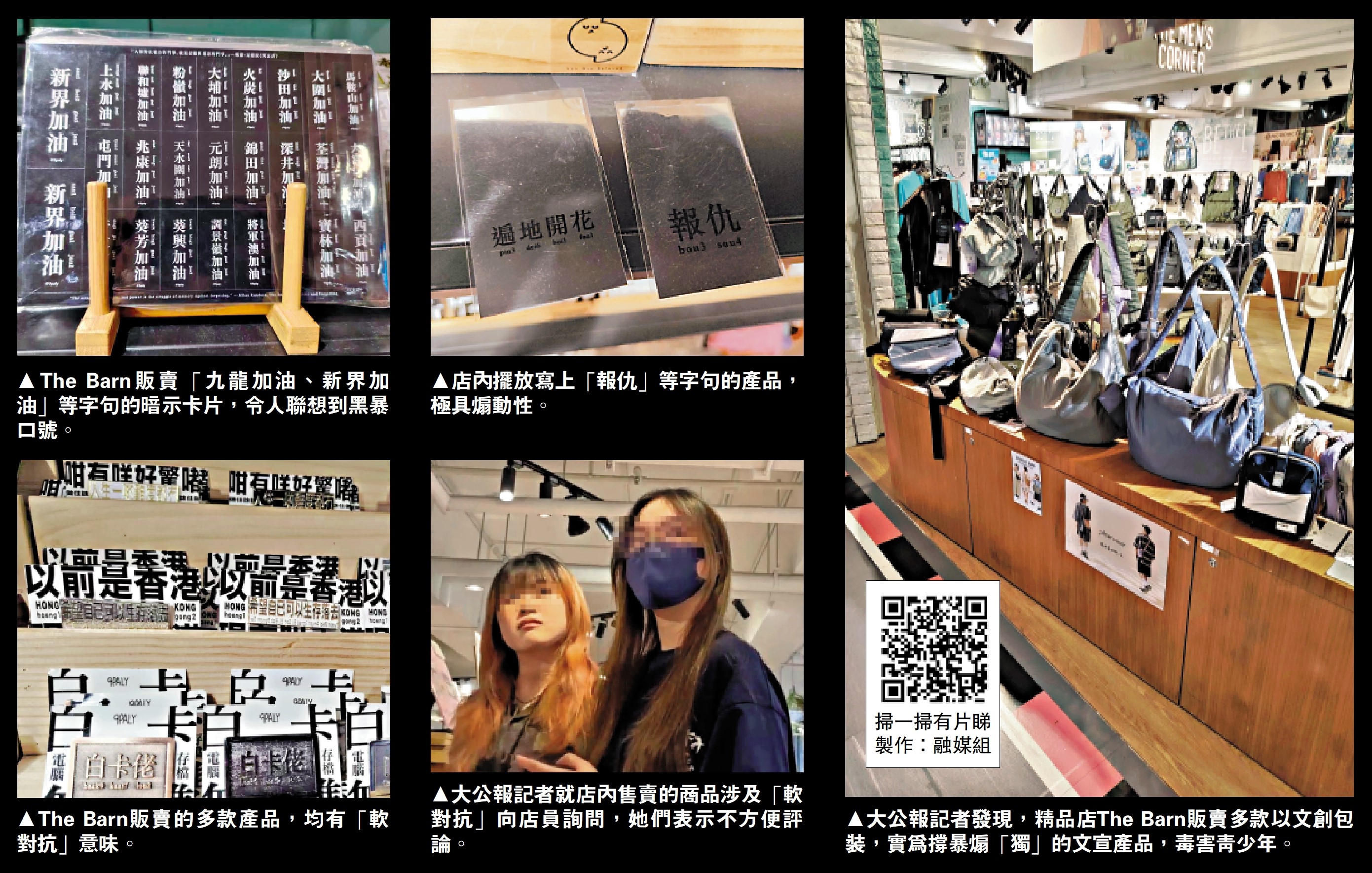 大公報記者近日巡查多個年輕人消費熱點,其中荔枝角D2 Place二期二樓一精品店The Barn,在眾多潮流型格產品中,一個角落擺放了多款黑色基調的「獨特」設計,渲染「香港衰落要偷生」的消極負面意識,吸引青少年注意,落「獨」於無形,店內有多種疑似「打擦邊球」的商品。The Barn表面看似與普通售賣文創商品的店舖無異,售賣包括公仔、桌遊卡及杯墊等。