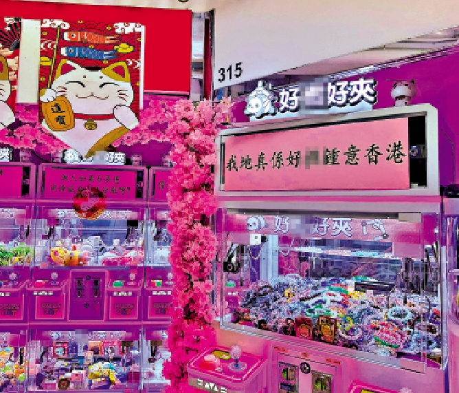 大公報記者旺角兆萬廣場內,不少昔日格仔店已變成了打卡點,吸引不少年輕人及旅客前來拍照。然而就在一樓升降機口,一家夾公仔店卻非常招搖,上樓都能夠看到大字寫着「我地真係好×鍾意香港」,這是2019年黑暴期間,幾乎每一個暴力示威現場都會出現的標語。