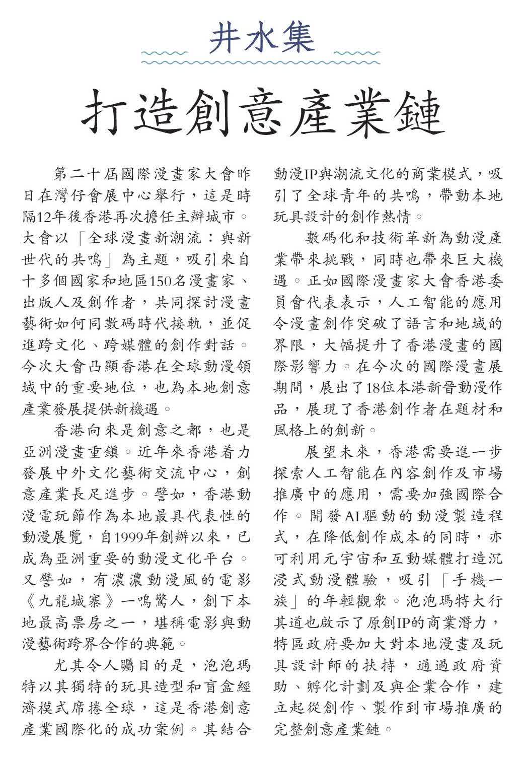 展望未來,香港需要進一步探索人工智能在內容創作及市場推廣中的應用,需要加強國際合作。開發AI驅動的動漫製造程式,在降低創作成本的同時,亦可利用元宇宙和互動媒體打造沉浸式動漫體驗,吸引「手機一族」的年輕觀眾。泡泡瑪特大行其道也啟示了原創IP的商業潛力,特區政府要加大對本地漫畫及玩具設計師的扶持,通過政府資助、孵化計劃及與企業合作,建立起從創作、製作到市場推廣的完整創意產業鏈。