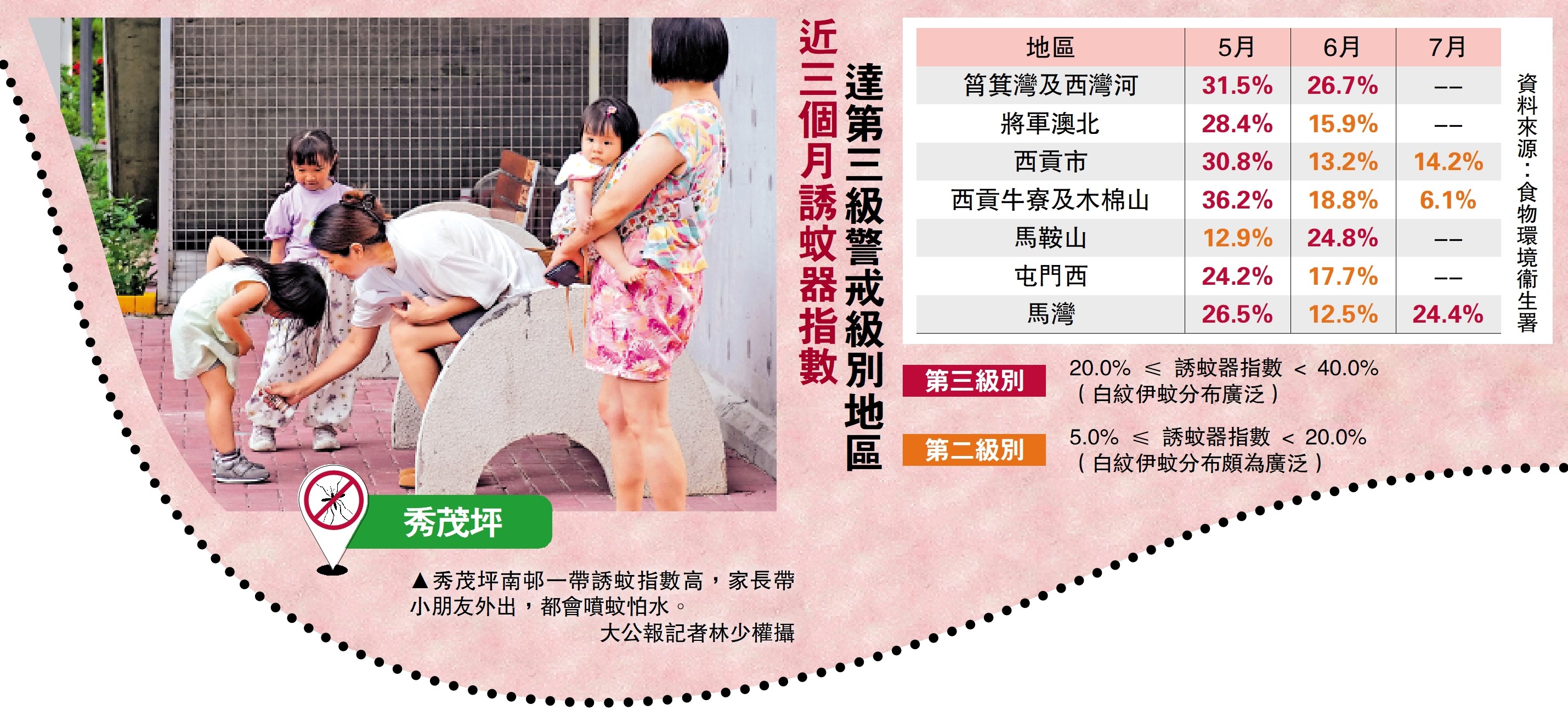 大公報記者昨日實地走訪部分錄得三級或二級蚊患指數的地區,馬灣於5月及7月的誘蚊器指數均達第三級警戒級別,代表白紋伊蚊分布廣泛,珀麗灣街坊梁小姐表示,屋苑一帶沒覺得蚊子增多;昨日到舊碼頭一帶遊玩的鄧小姐表示,早前聽聞馬灣蚊患指數高,但她不太擔心,昨日遊玩時只見到一隻蚊。
