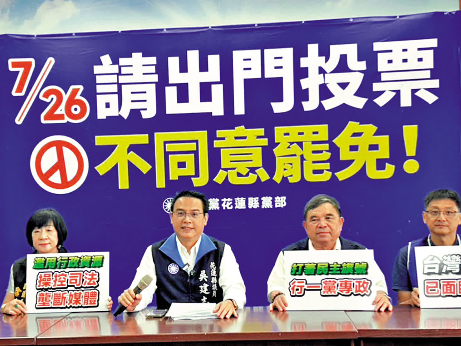 《觀察》雜誌發行人紀欣表示,去年「立委」選舉,民進黨「立委」席次少於國民黨,失去立法機構第一大黨的位置,很不甘心,於是企圖清除異己、重返完全執政,因而發起「大罷免」。若民進黨得逞,過去一年國民黨和民眾黨合作通過的有利台灣民生和兩岸和平的法案都可能會被推翻。她呼籲所有愛台灣、愛和平、愛民主的人都能在7月26日出門投下「不同意票」,重挫民進黨當局的囂張氣焰。