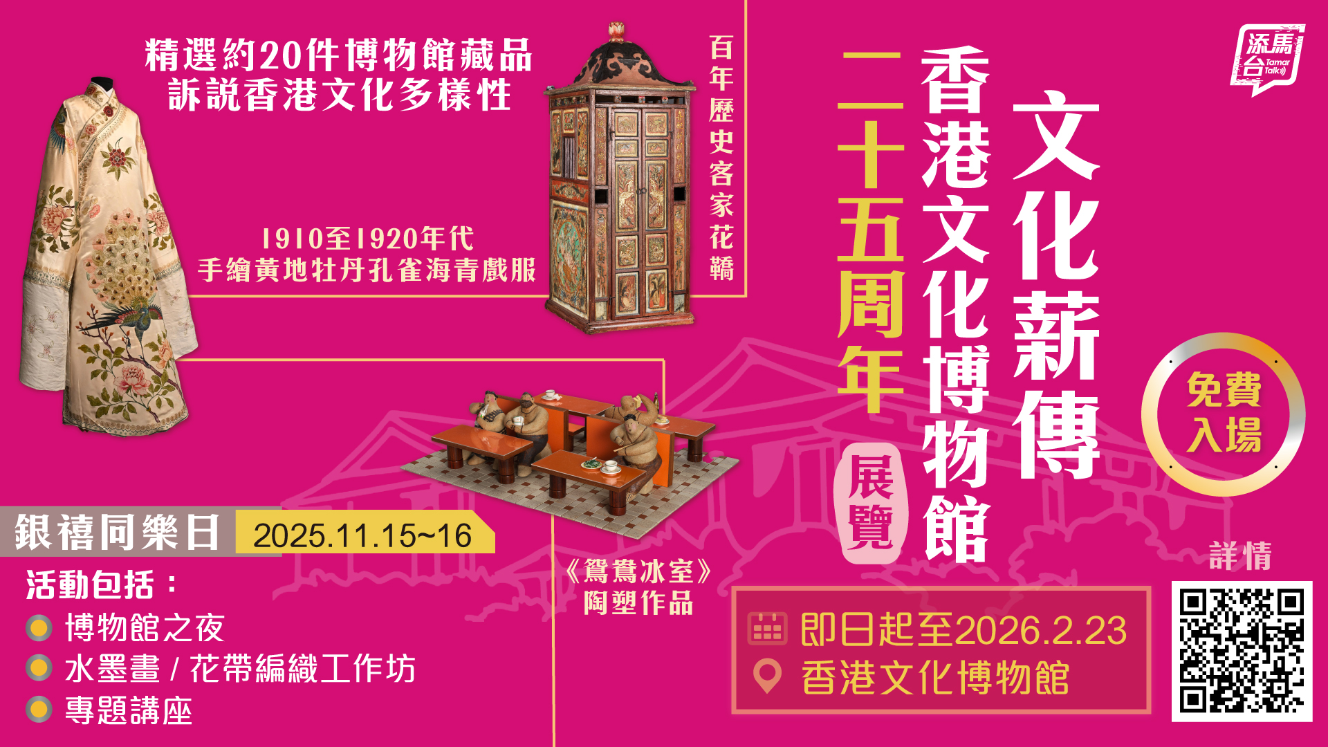 「文化薪傳—香港文化博物館二十五周年」展覽介紹博物館成立經過、曾經舉辦的展覽,以及當中的精選藏品。