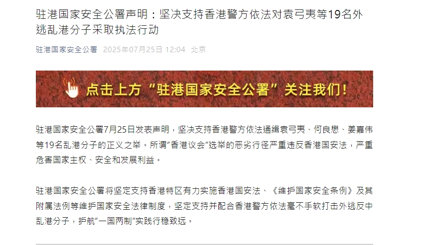 大公文匯全媒體報道,駐港國家安全公署今日(25日)發表聲明,堅決支持香港警方依法通緝袁弓夷、何良懋、姜嘉偉等19名亂港分子的正義之舉。所謂「香港議會」選舉的惡劣行徑嚴重違反香港國安法,嚴重危害國家主權、安全和發展利益。