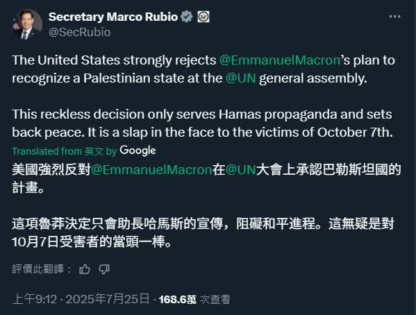 魯比奧稱,「美國強烈反對馬克龍在聯合國大會上承認巴勒斯坦國的計劃。」他還將法方的做法描述為「魯莽的決定」。