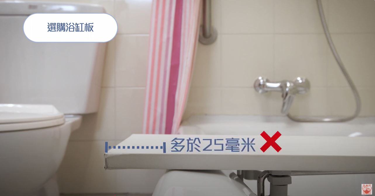 長者最理想是在企缸使用沐浴椅淋浴。但若未能把浴缸改裝成為企缸,亦可使用浴缸板,但必須先評估長者的能力和浴室環境並清楚了解浴缸板的使用方法。浴缸板提供一個穩固的平台,讓使用者能坐著進出浴缸淋浴,有效減低滑倒的意外。使用時可搭配安全扶手和浴缸防滑墊。建議將沐浴用品、毛巾等必需品放在觸手可及的位置,方便長者自理,提升沐浴的便利性。
